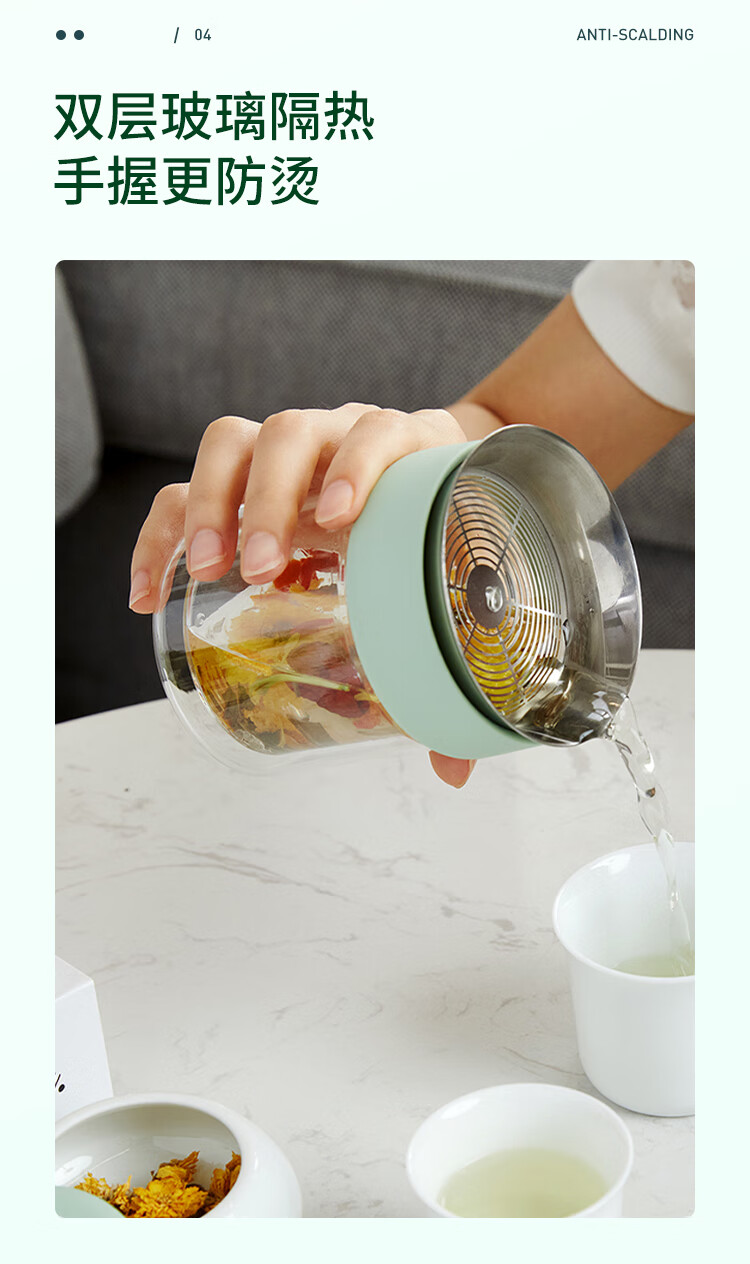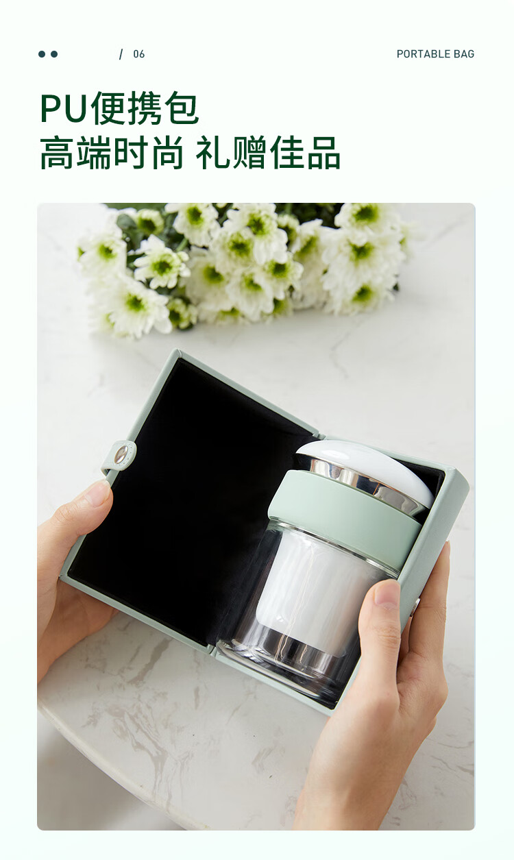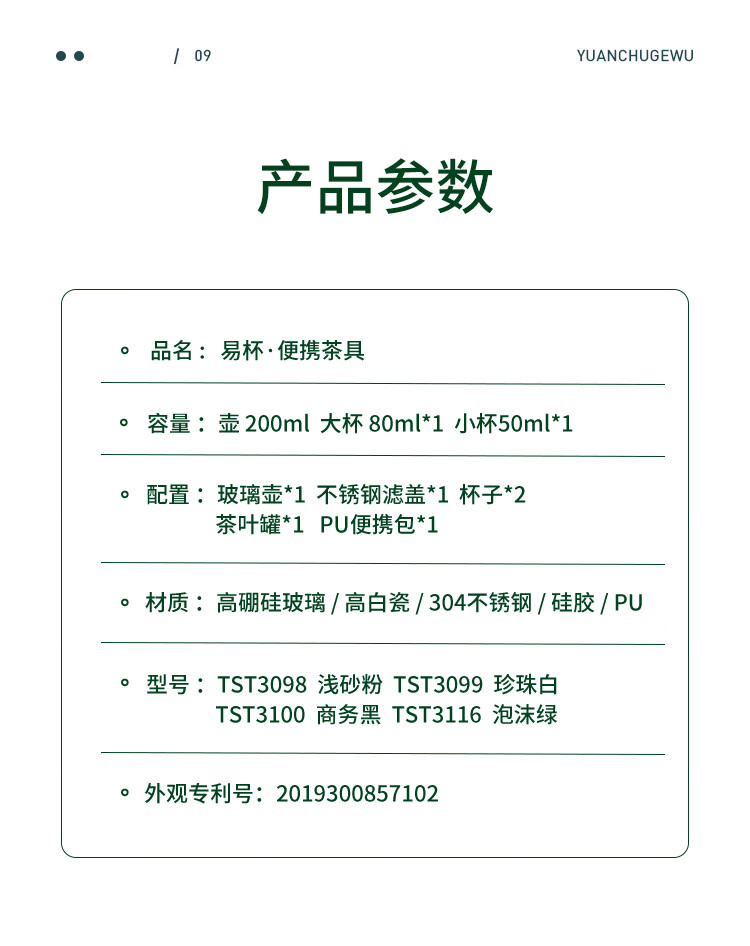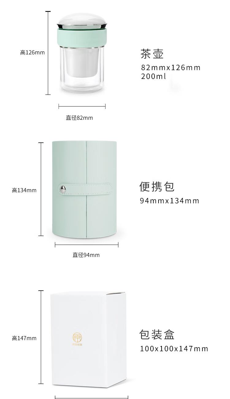 功能:休闲茶具 容量:壶 200ml 大杯 80ml 小杯 50ml 材质:高硼硅玻璃 / 高白瓷 / 304不锈钢 / 硅胶 / PU 配置:玻璃壶*1 不锈钢滤盖*1 杯子*2 茶叶罐*1 PU便携包*1 TST3116 泡沫绿