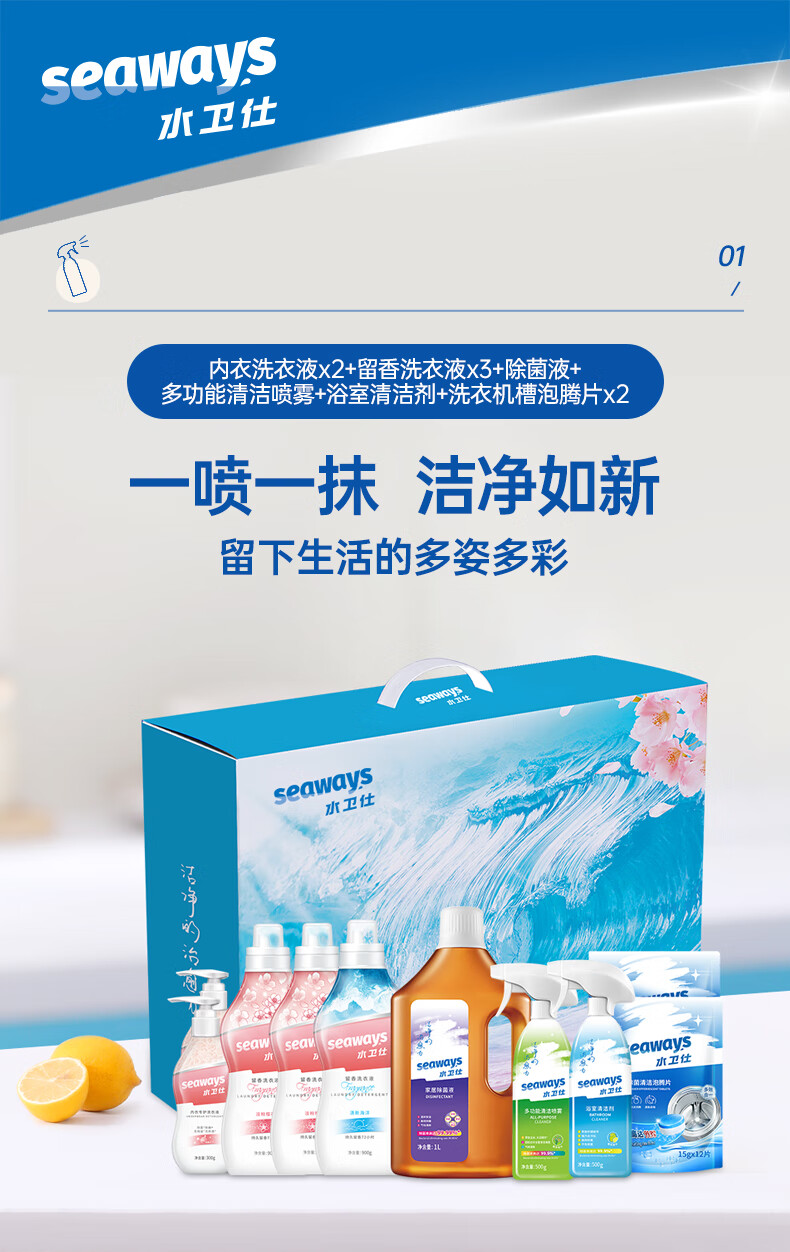 (1)水卫士浴室清洁剂-带喷枪500g*1 (2)水卫士厨房重油污净-带喷枪480g*1 (3)水卫士家居多功能清洁喷雾-带喷枪500g*1 (4)水卫士家居消毒液1L*1 (5)水卫士强效洁厕净500g*1 (6)水卫士地板清洁剂500ml*1 (7)水卫士洗衣机槽清洁剂125g/袋*3 (8)水卫士香氛洗衣液淡粉樱花900g*1 (9)水卫仕香氛洗衣液(海洋)900g/瓶 (10)水卫仕内衣洗衣液300g/瓶 (11)水卫仕除 菌除螨洗衣液2kg/瓶