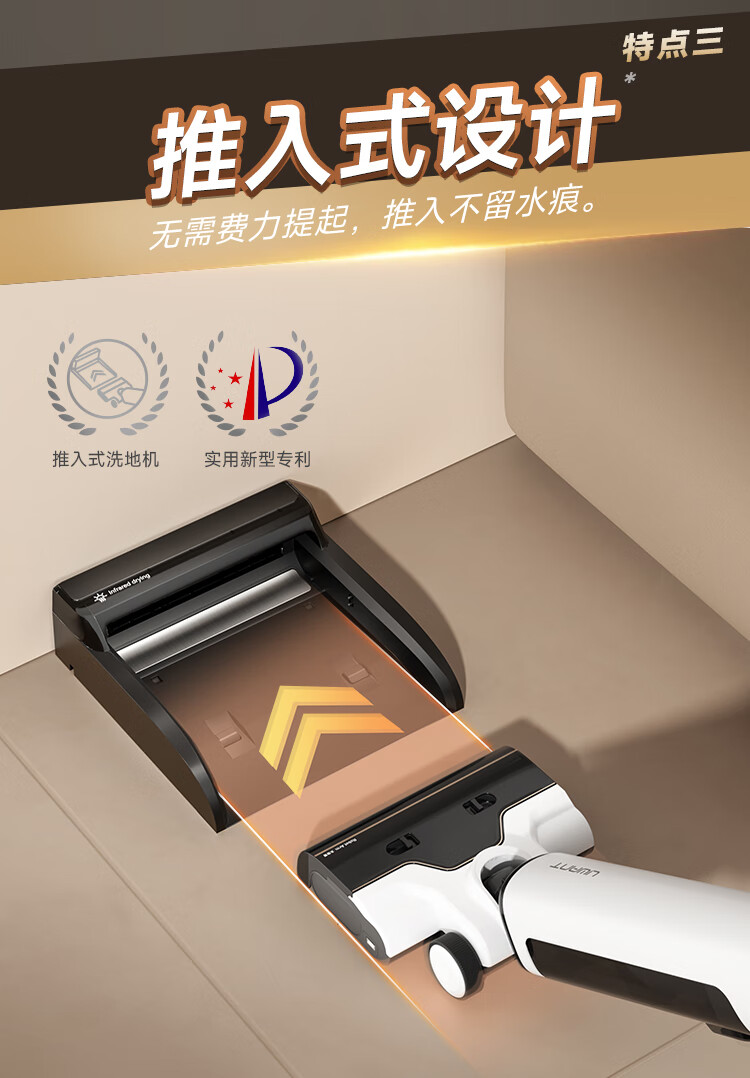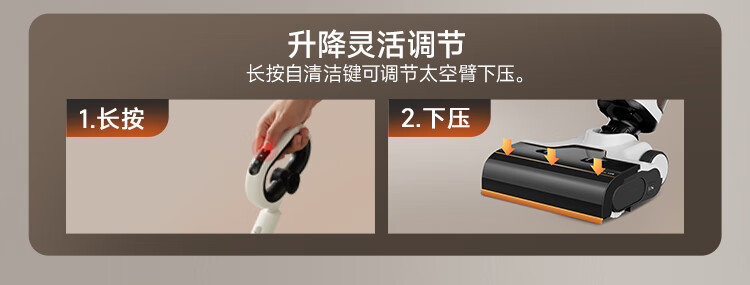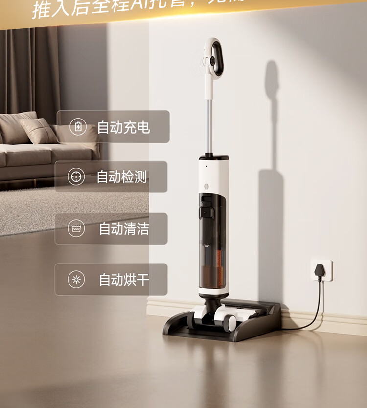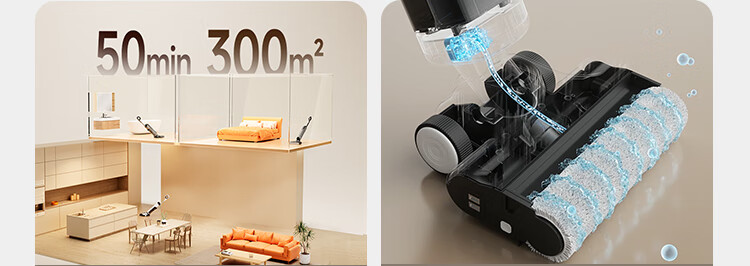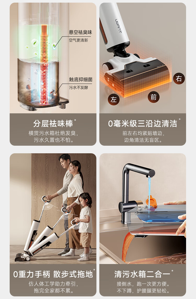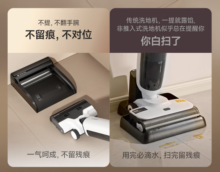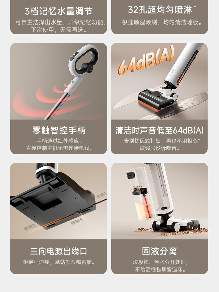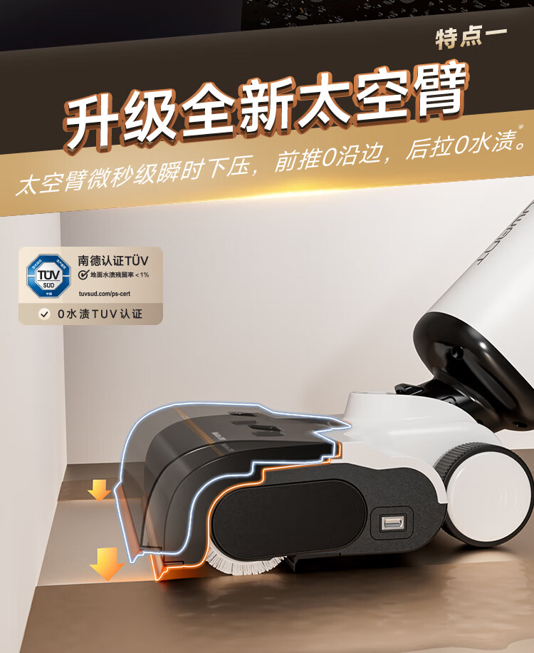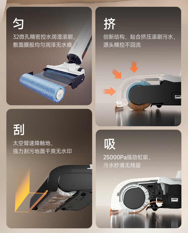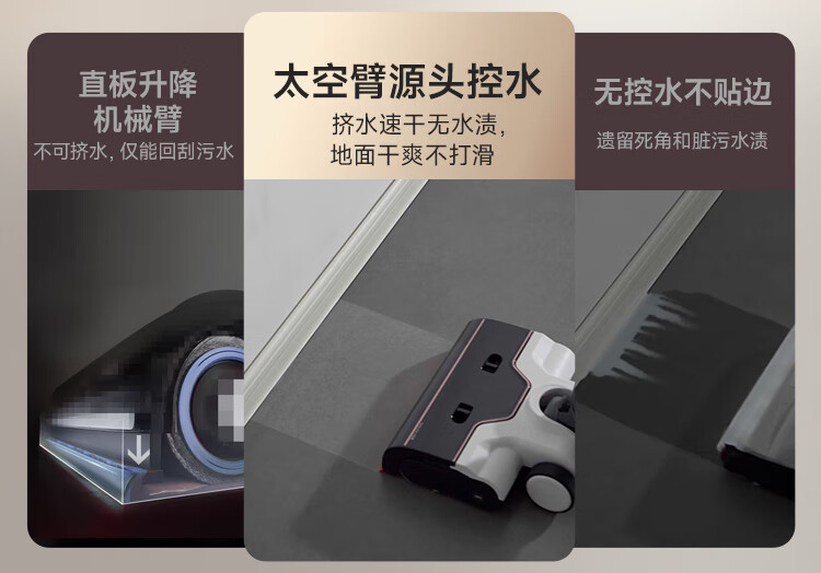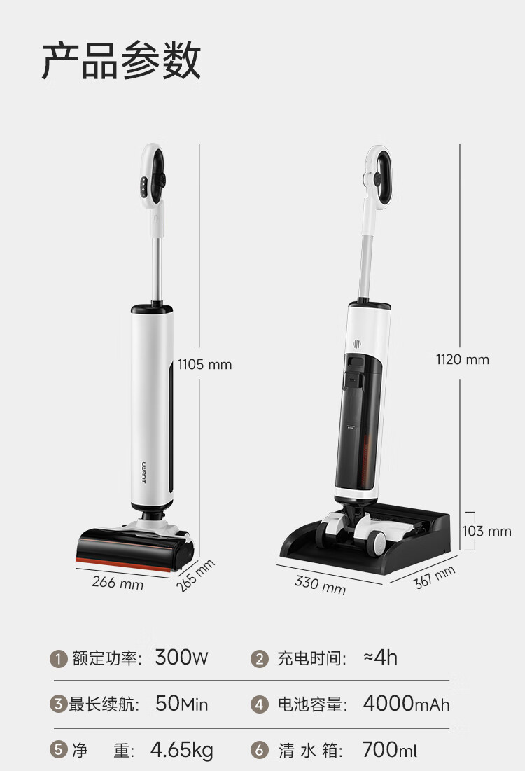 产品尺寸:266*265*1105 基站尺寸:367*330*103 产品+基站尺寸:340*329*1120mm 产品毛重:8.3kg 外箱尺寸:740*347*280mm 32微孔精密控水润湿滚刷敷面膜般均匀润泽无水痕 创新结构,贴合挤压滚刷污水源头精控不回流 太空臂速降触地,强力刮污地面干爽无水印 25000Pa强劲虹吸,污水秒清无残留