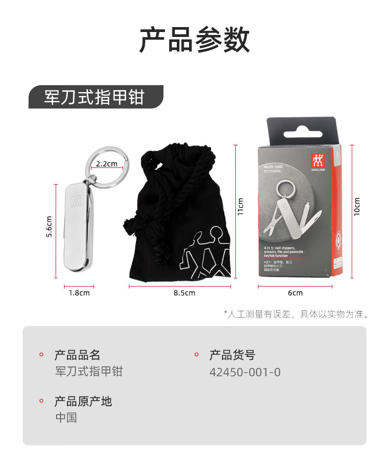 颜色分类:银 商品类型:个人洗漱/清洁/护理 适用对象:通用 产品材质:刀头硬化不锈钢 刀柄聚酯塑料 铁盒 型号:42450-001-0-APAC 产品描述: 功能六合一:折叠式指甲钳 钥匙扣环,便携小剪刀 指甲锉螺丝刀 刀身可折叠,小巧轻便