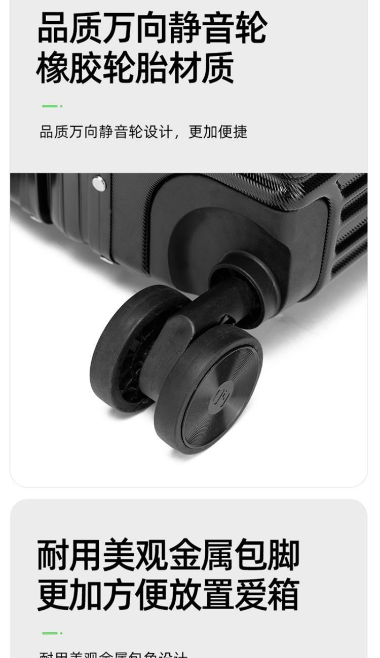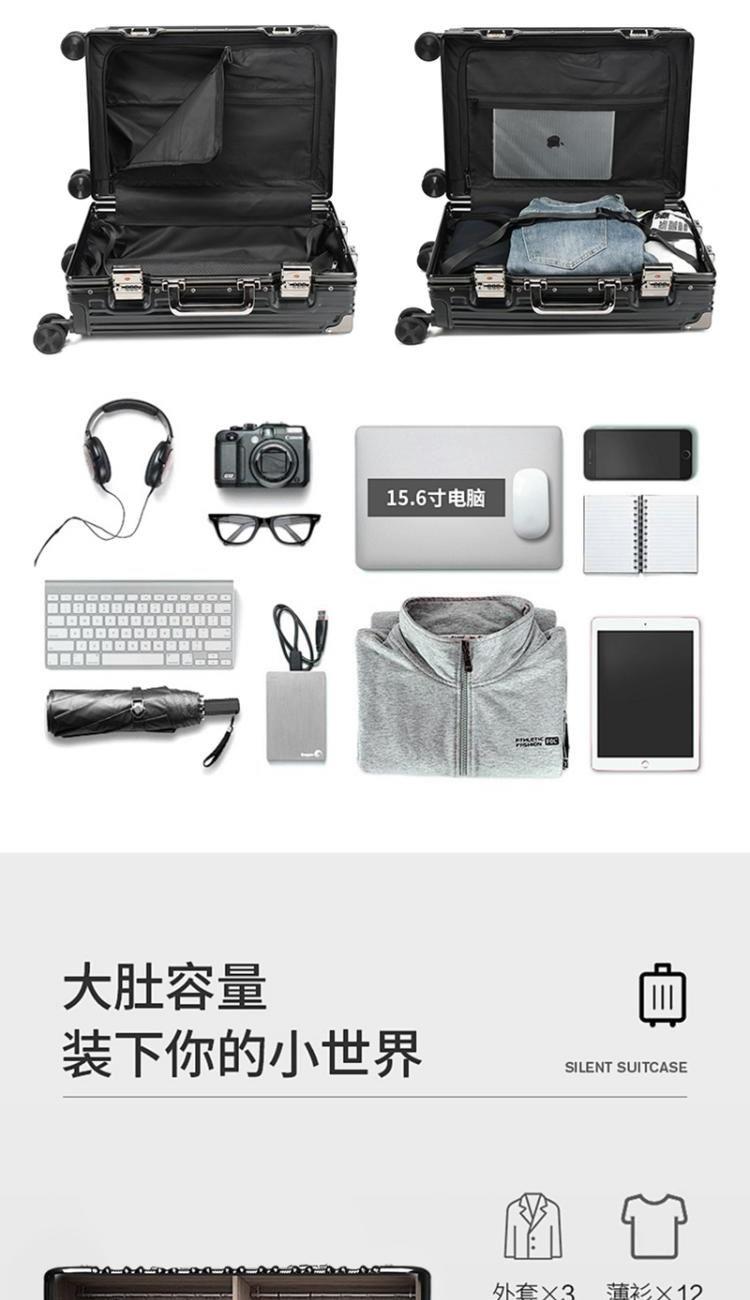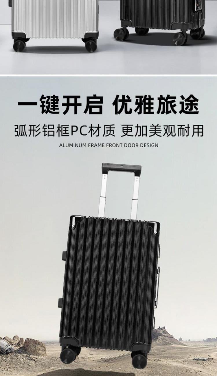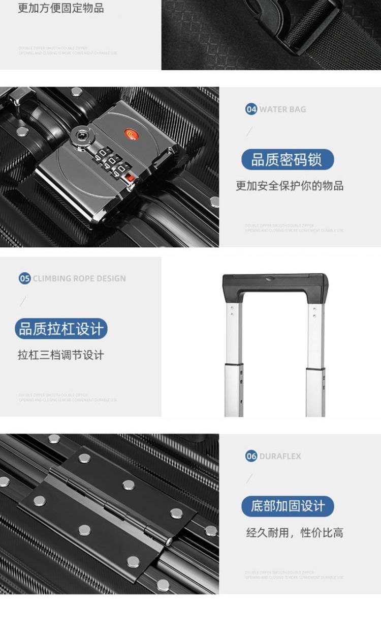 材质:PC 颜色:黑色/银色 规格:20寸 重量:3.5kg 包装方式:无纺布袋+纸箱 德国拜耳PC材质,质地轻盈,高耐热、抗冲击、阻燃、刚硬、柔韧(可踩、摔不变形),犹如护盾般保护着箱内物品;铝合金拉杆,航空铝材,美观耐用;海关密码锁,标准海关开箱检查锁具;全配色耐磨万向静音轮,运用跑车车轮的设计原理,采用静音材质包裹,360度自由旋转,降噪减震灵动自如,耐磨高弹性TPE材料,触感柔软,负重与减震能力俱佳; 采用苹果CNC边框工艺,贴合箱体的U型金属弧形框架,安全稳固经久耐用。