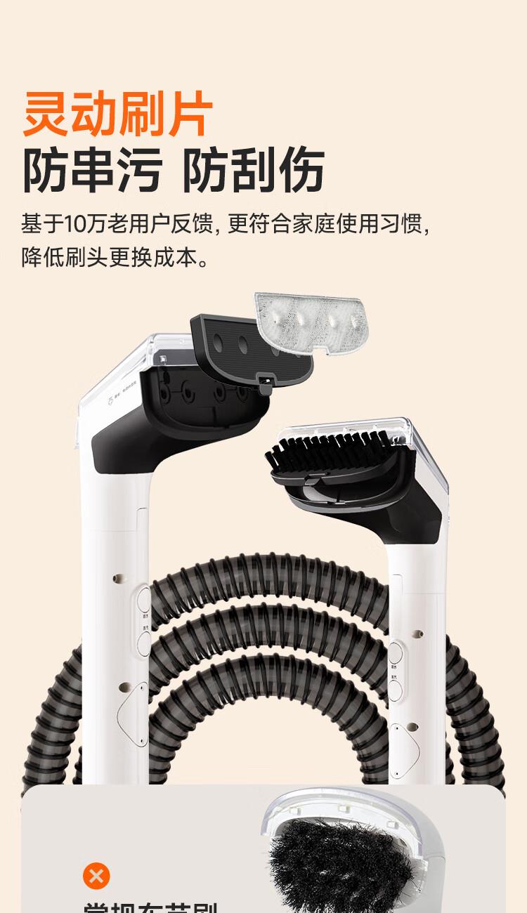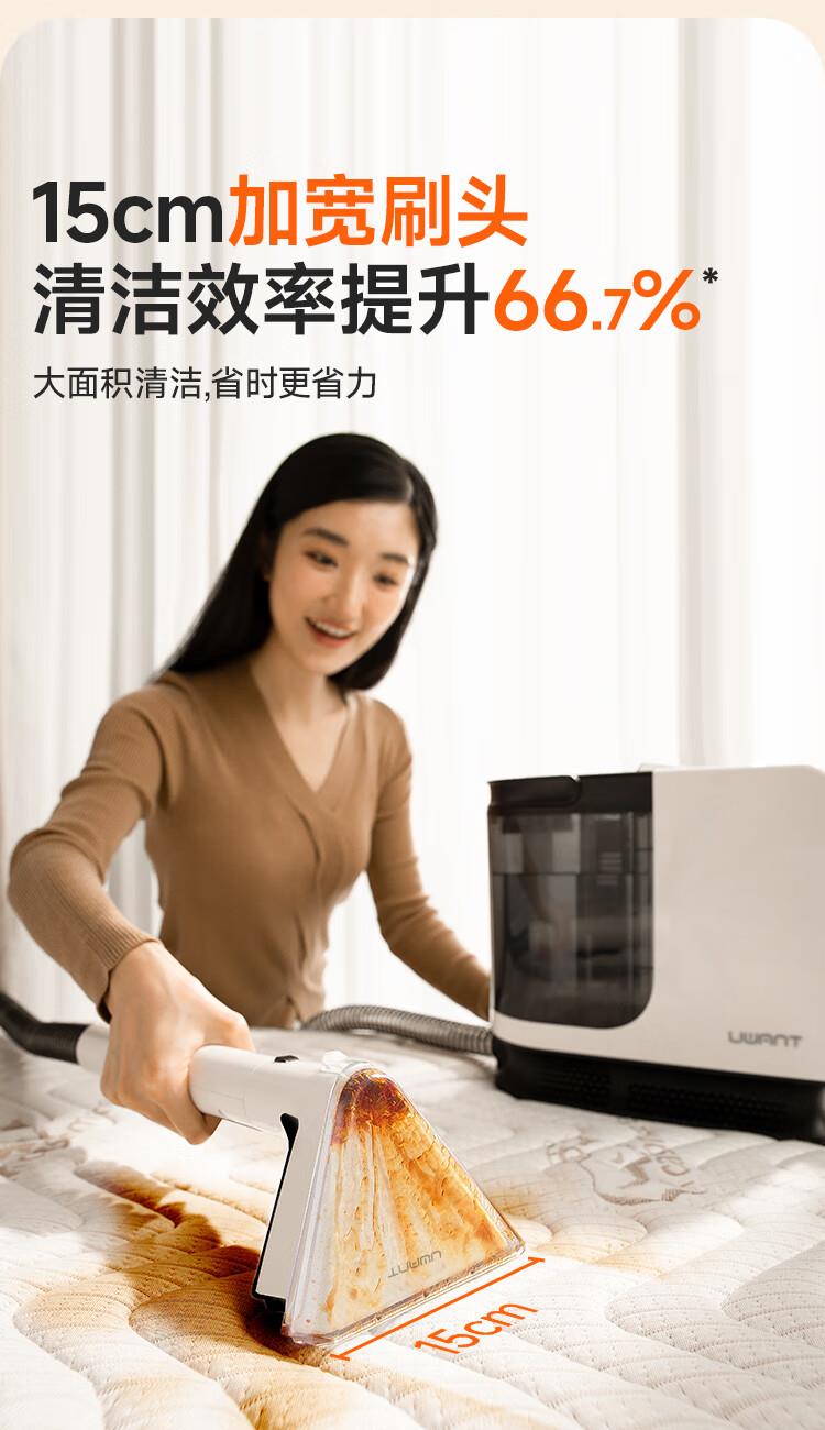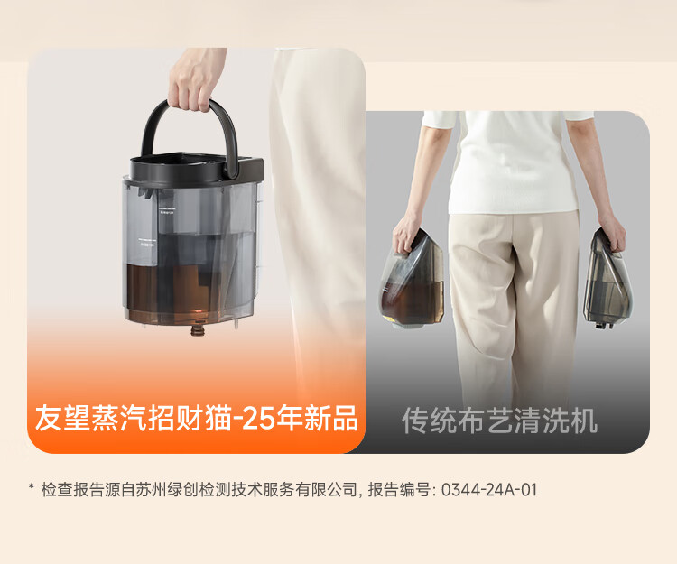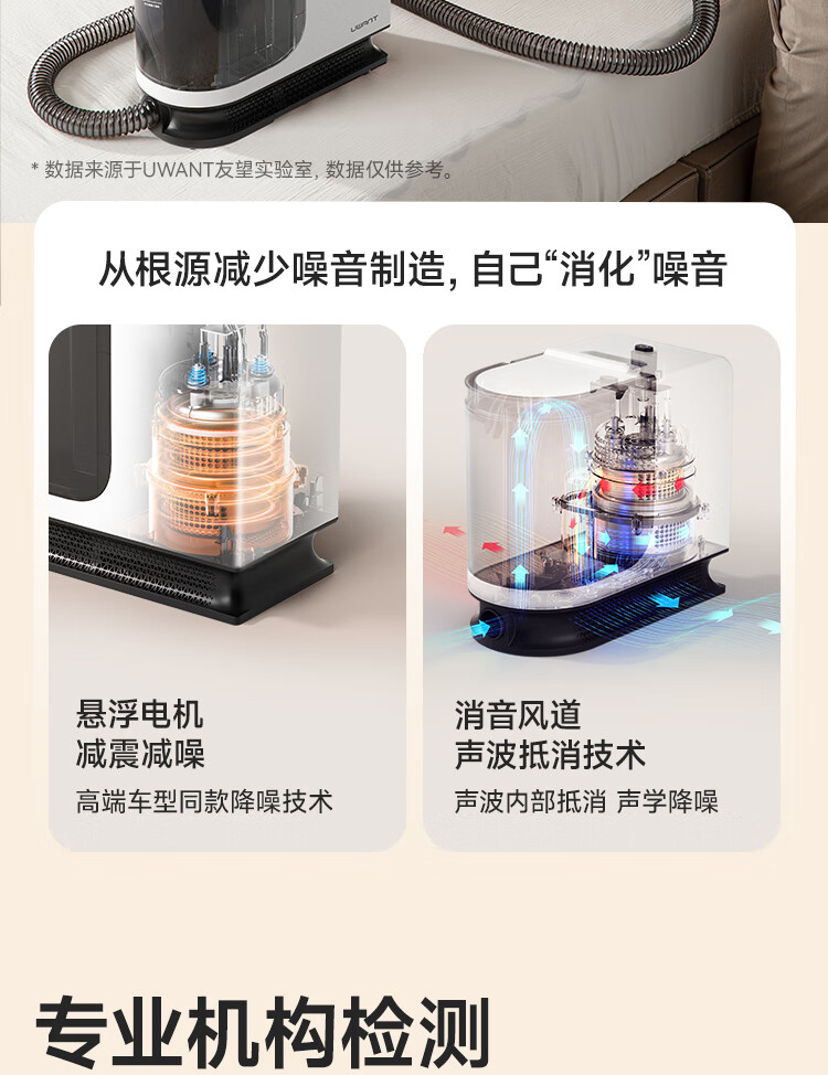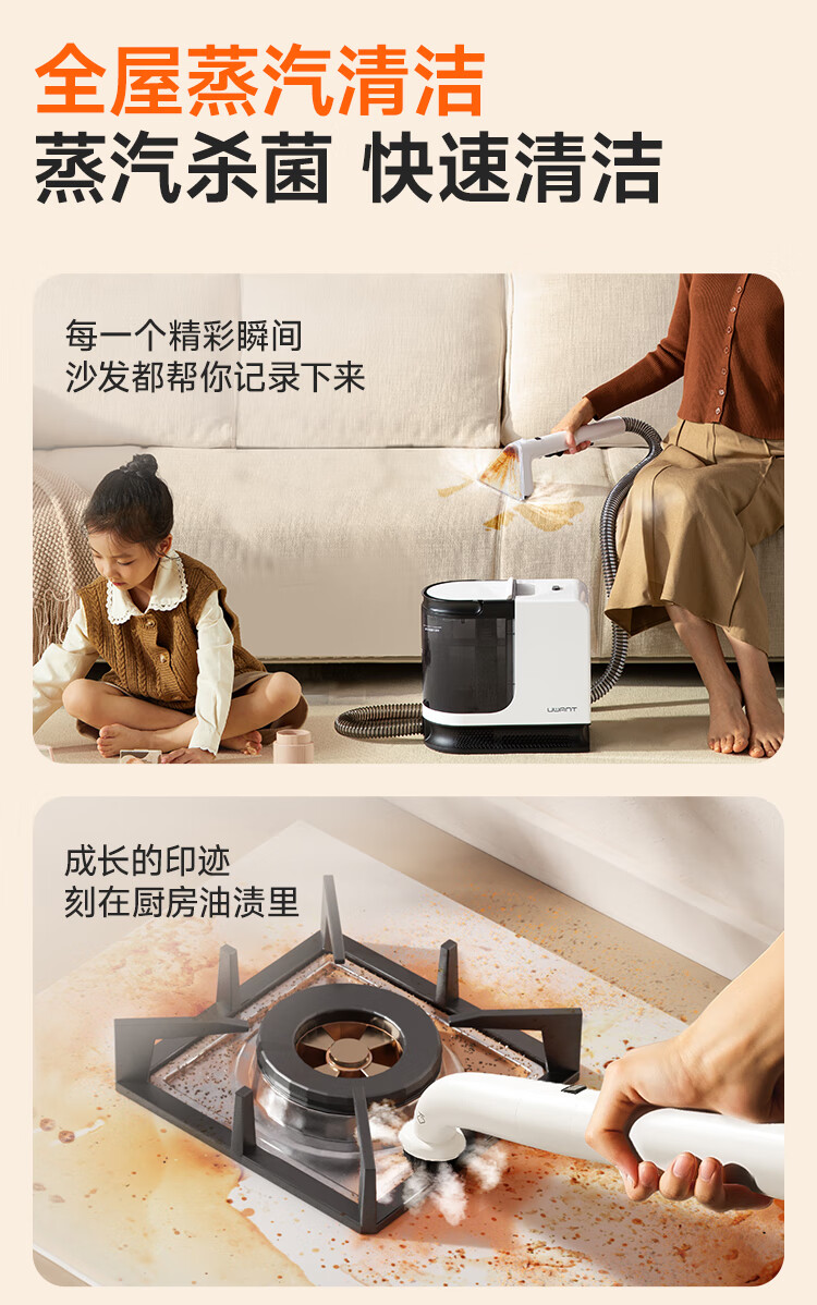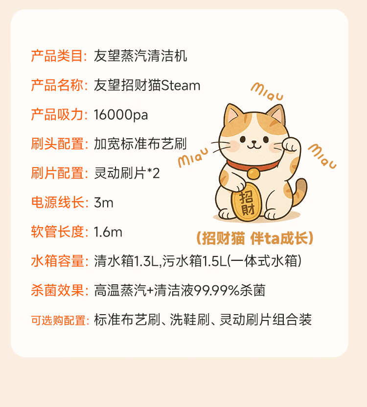 产品类目:友望蒸汽清洁机 产品吸力:16000pa 刷头配置:加宽标准布艺刷 刷片配置:灵动刷片*2 电源线长:3m 软管长度: 1.6m 双重降噪技术加持,工作声音<75dB(A) 16000Pa*低噪大吸力,吸的更深、吸的更净、干的更快!