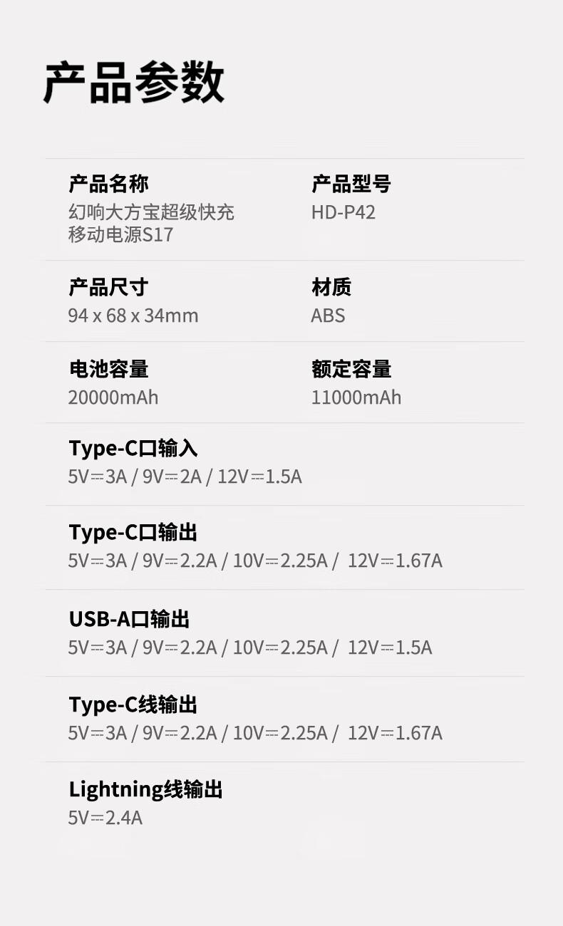 幻响大方宝超级快充移动电源S17充电宝20000mAh