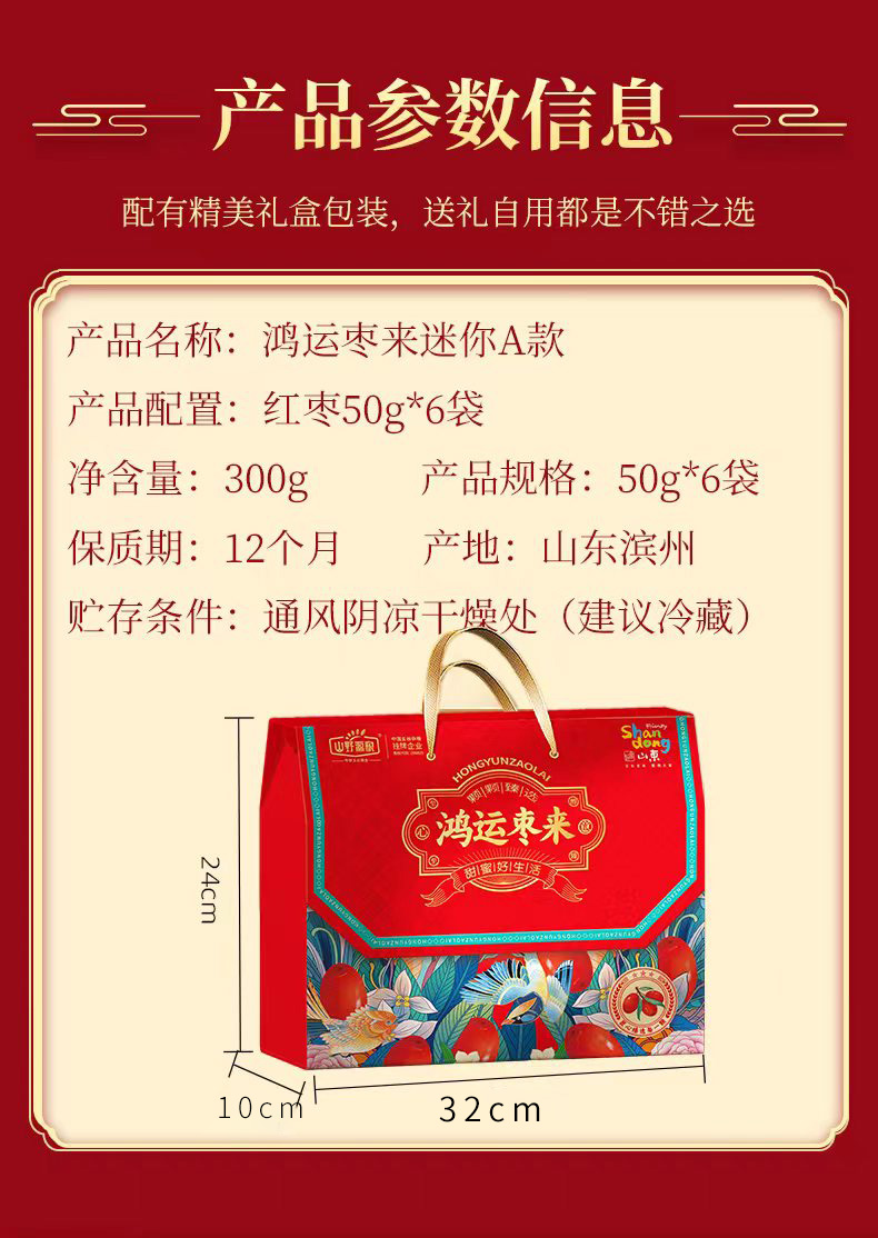 产品规格配置:红枣50g*6袋 盒尺寸:32*24*10cm 箱尺寸:63*34*50 箱重量:7kg 箱体积:0.107方