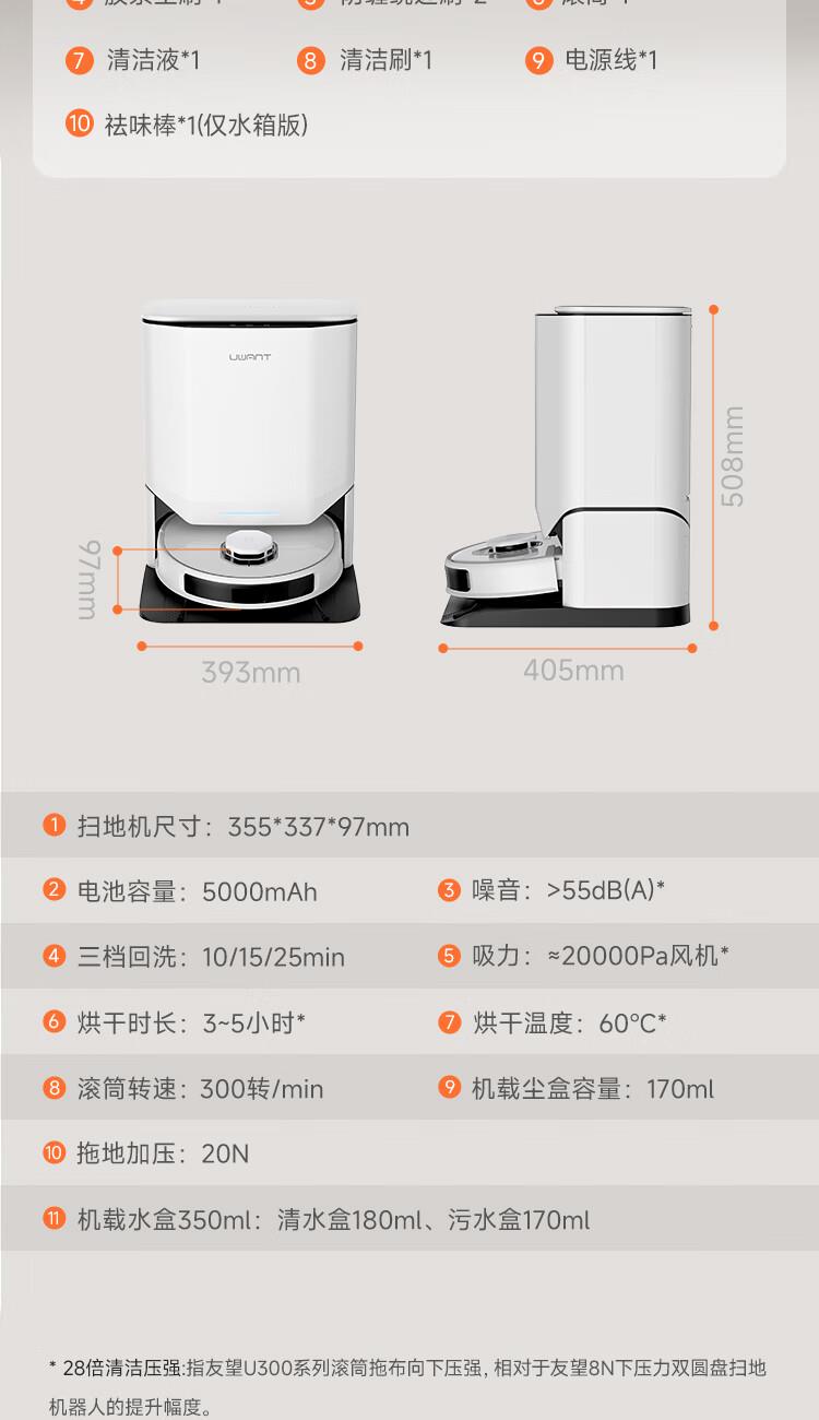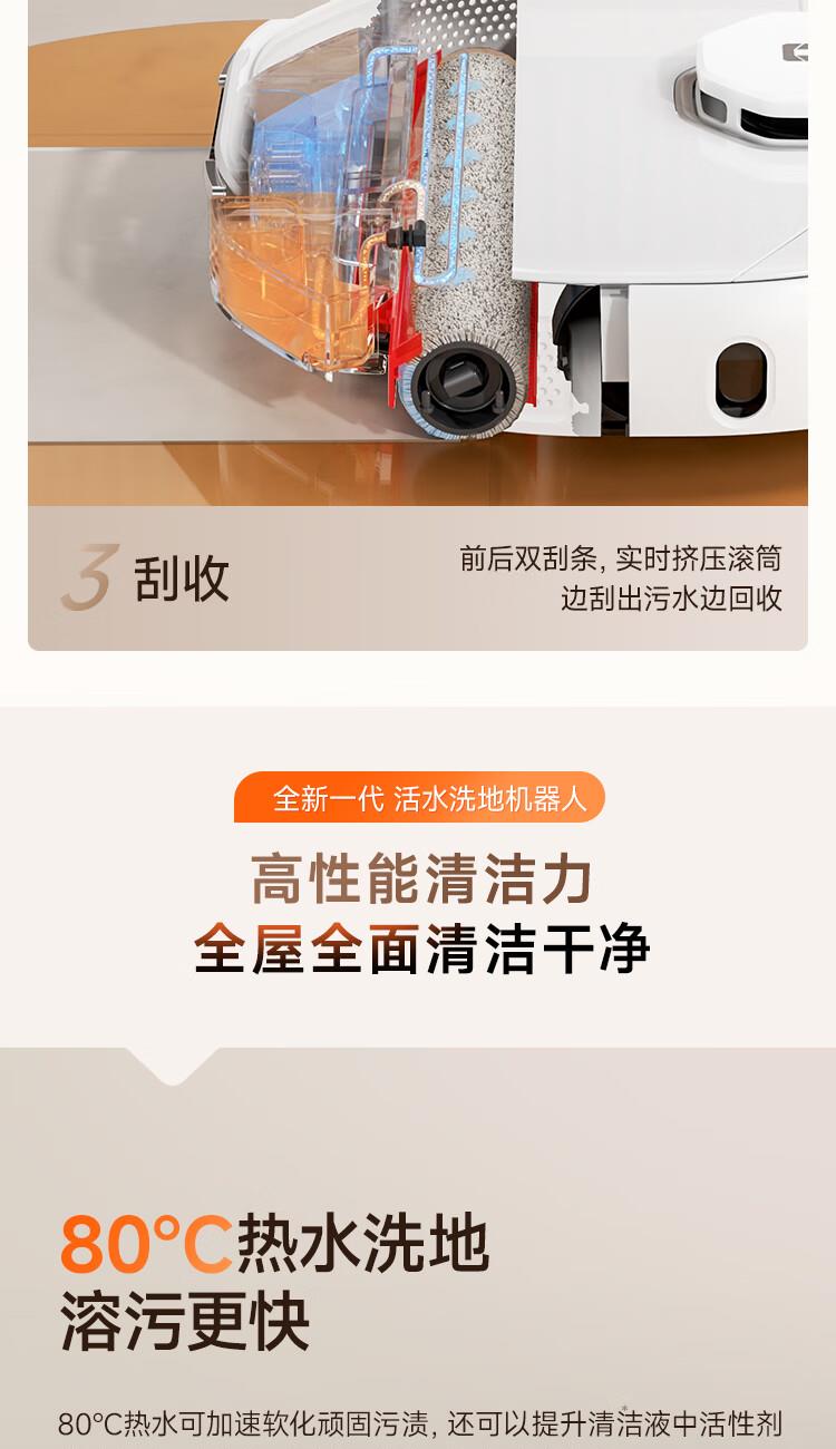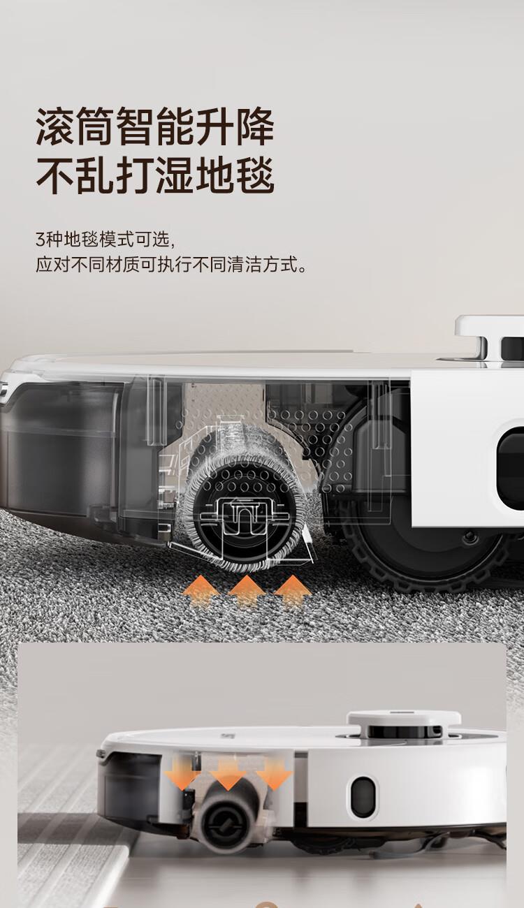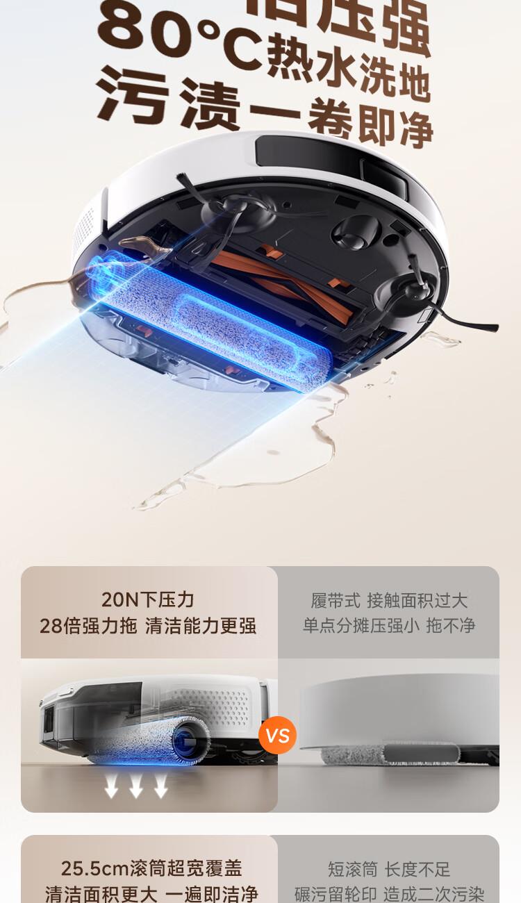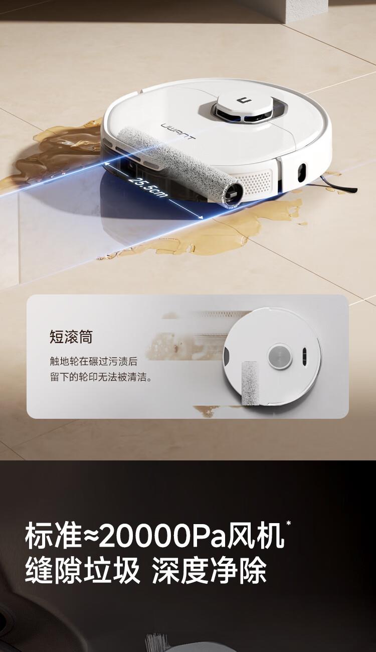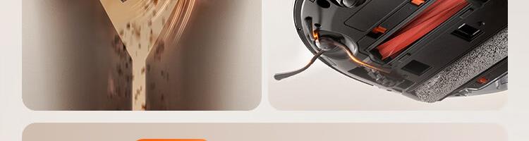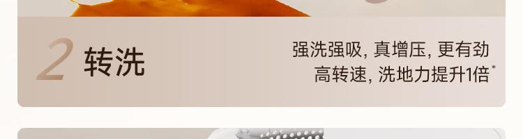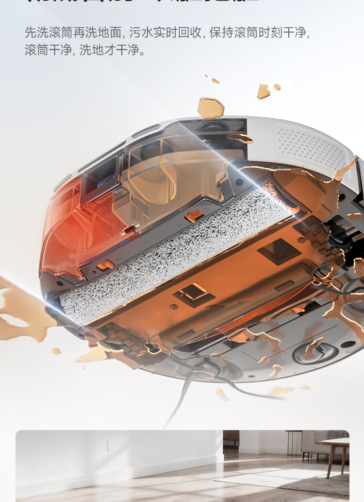 扫地机尺寸:351*346*97mm 电池容量:5000mAh 三档回洗:10/15/25min 烘干时长:3~5小时 滚筒转速:300转/min 噪音:>55dB(A) 吸力:~18000Pa风机 烘干温度:60°C 机载尘盒容量:170ml 黄金飓风吸尘升级大马力风机,吸的更干净 黄金夹角边刷,双旋风防缠绕 活水高速碾压洗地,高温+高压+高转速,拖的干净,缺一不可