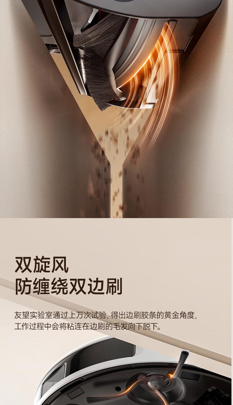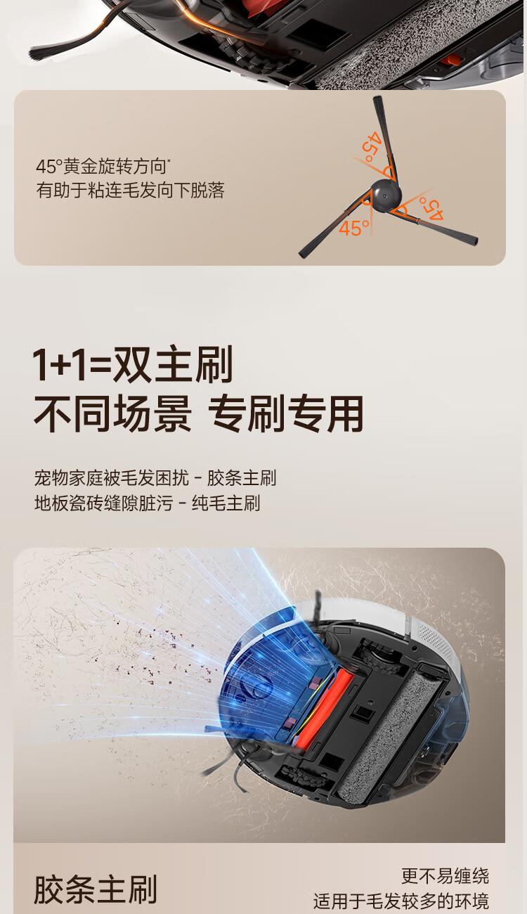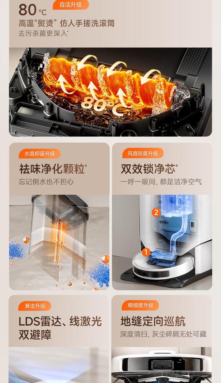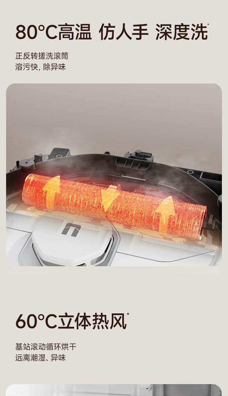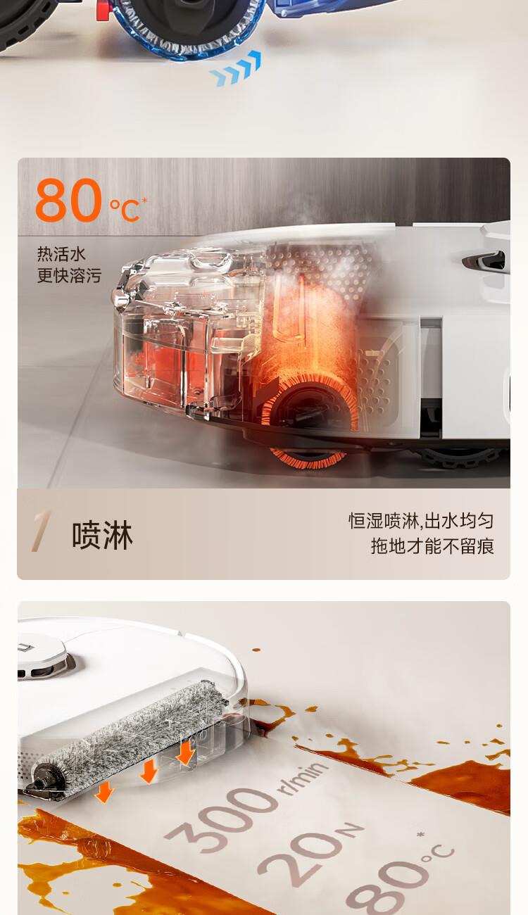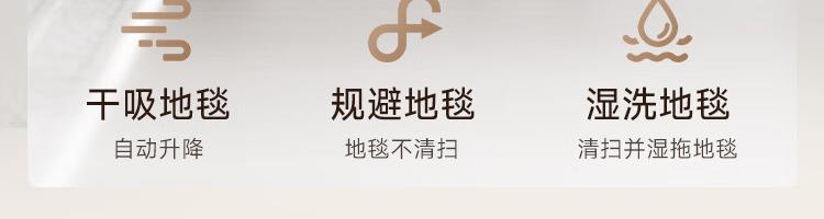 扫地机尺寸:351*346*97mm 电池容量:5000mAh 三档回洗:10/15/25min 烘干时长:3~5小时 滚筒转速:300转/min 噪音:>55dB(A) 吸力:~18000Pa风机 烘干温度:60°C 机载尘盒容量:170ml 黄金飓风吸尘升级大马力风机,吸的更干净 黄金夹角边刷,双旋风防缠绕 活水高速碾压洗地,高温+高压+高转速,拖的干净,缺一不可