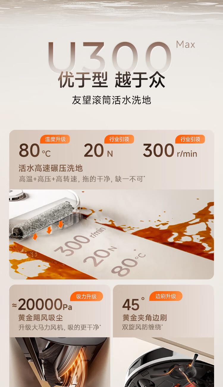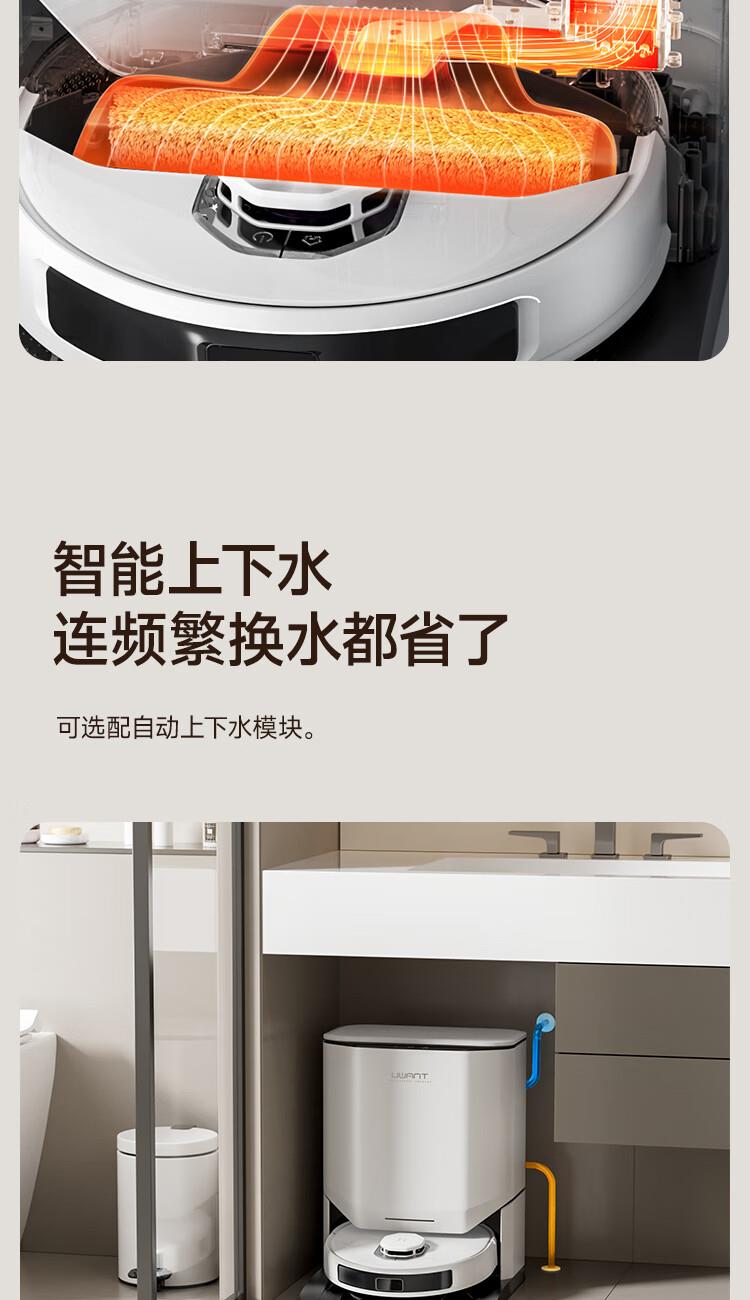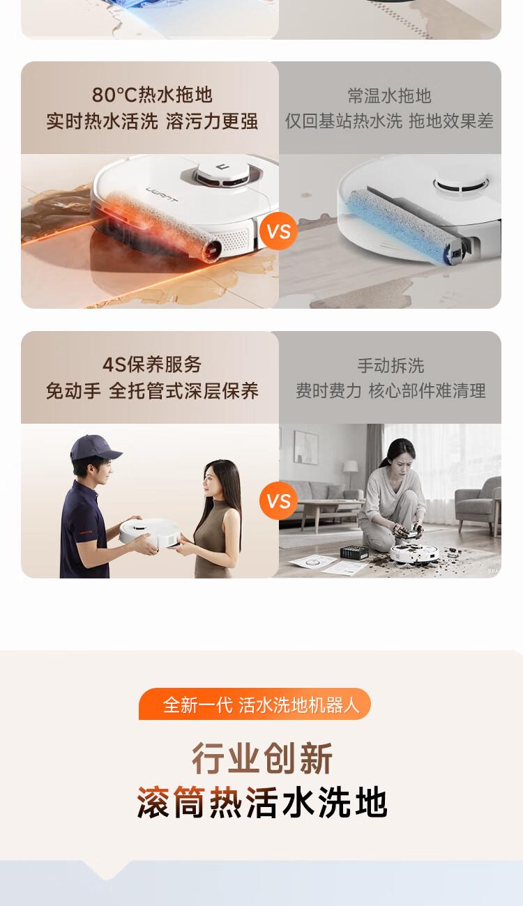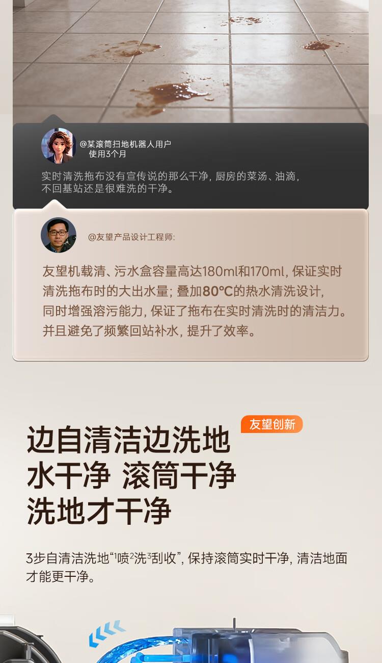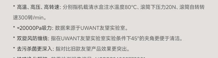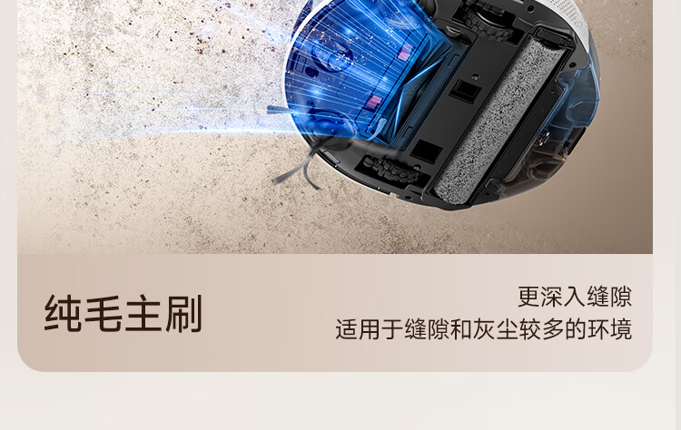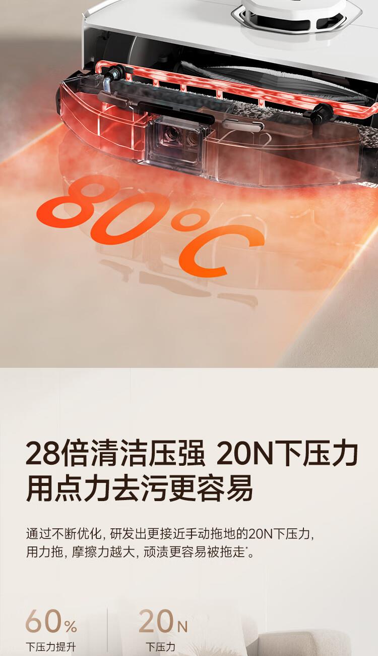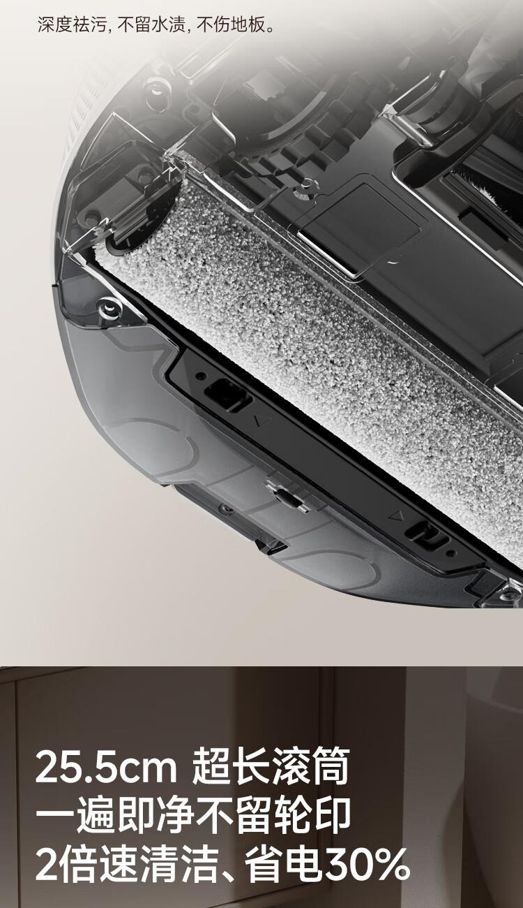 扫地机尺寸:351*346*97mm 电池容量:5000mAh 三档回洗:10/15/25min 烘干时长:3~5小时 滚筒转速:300转/min 噪音:>55dB(A) 吸力:~18000Pa风机 烘干温度:60°C 机载尘盒容量:170ml 黄金飓风吸尘升级大马力风机,吸的更干净 黄金夹角边刷,双旋风防缠绕 活水高速碾压洗地,高温+高压+高转速,拖的干净,缺一不可