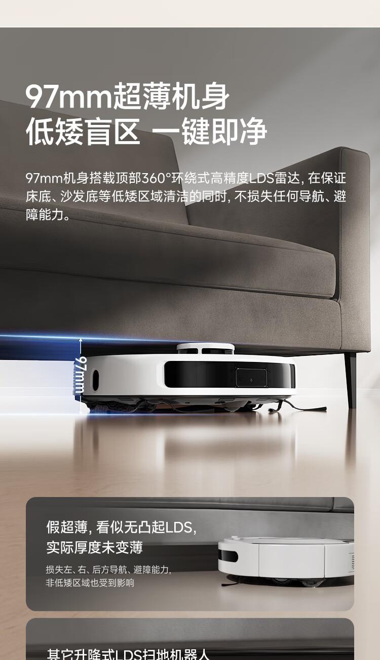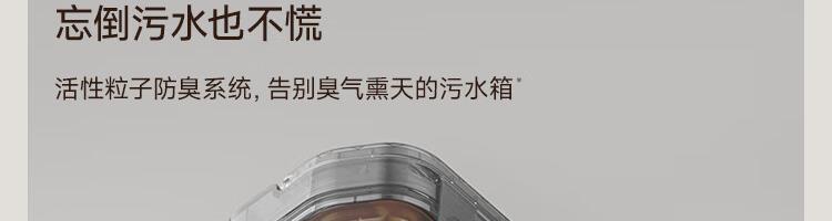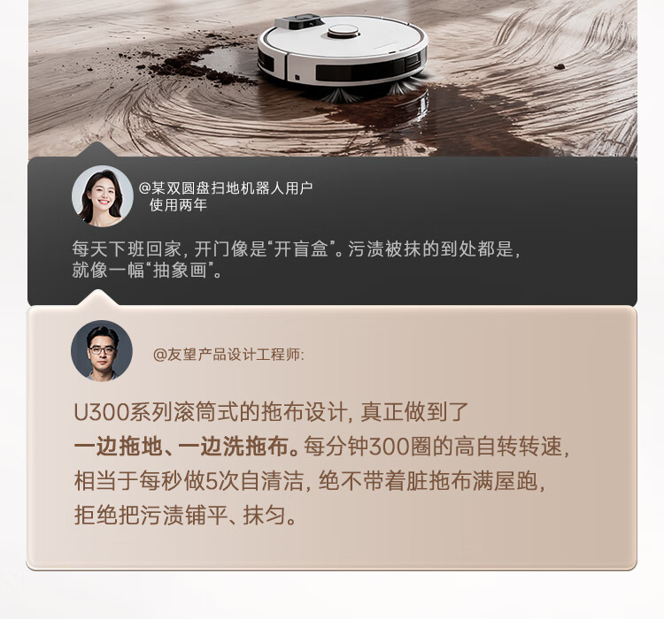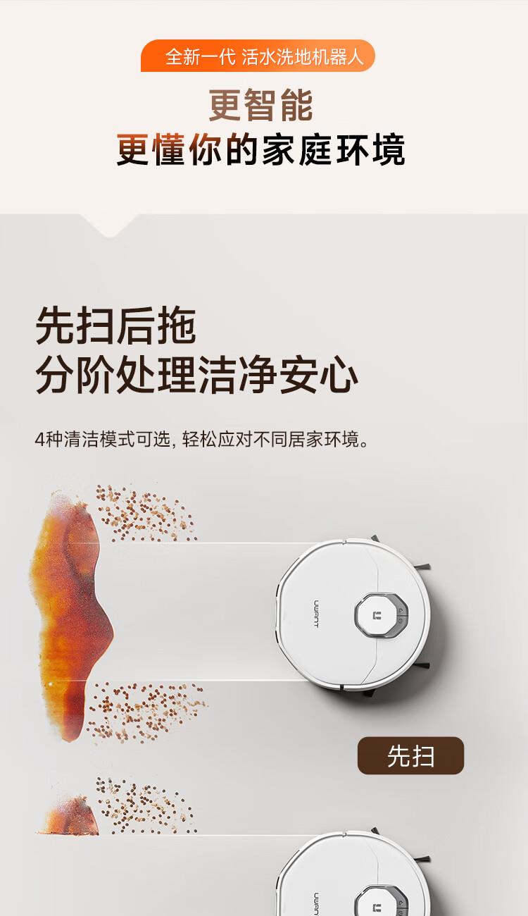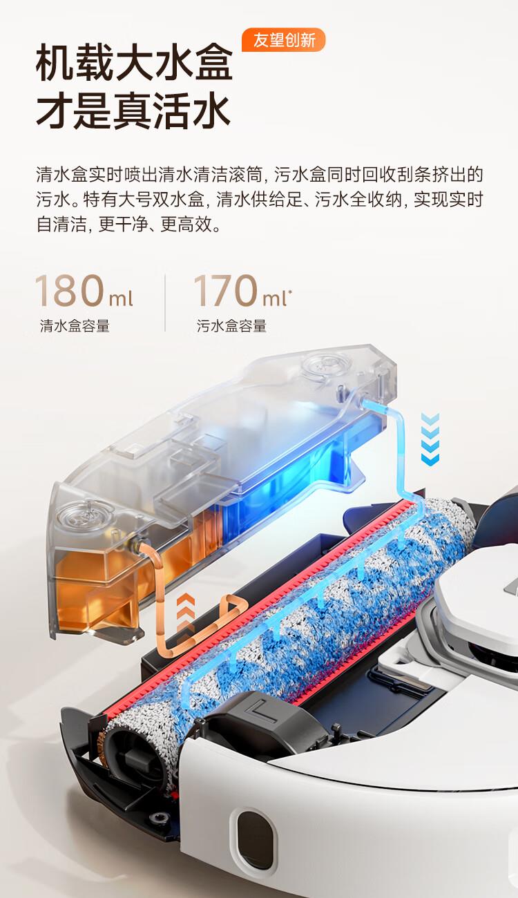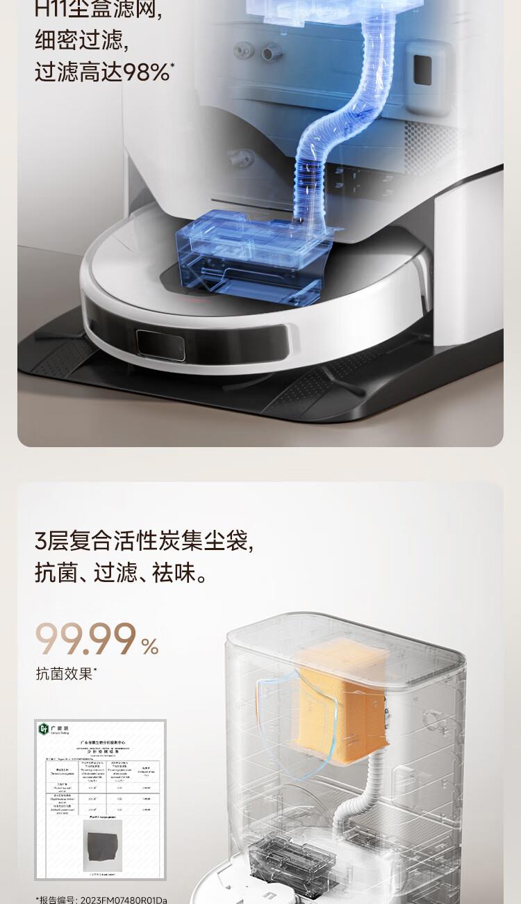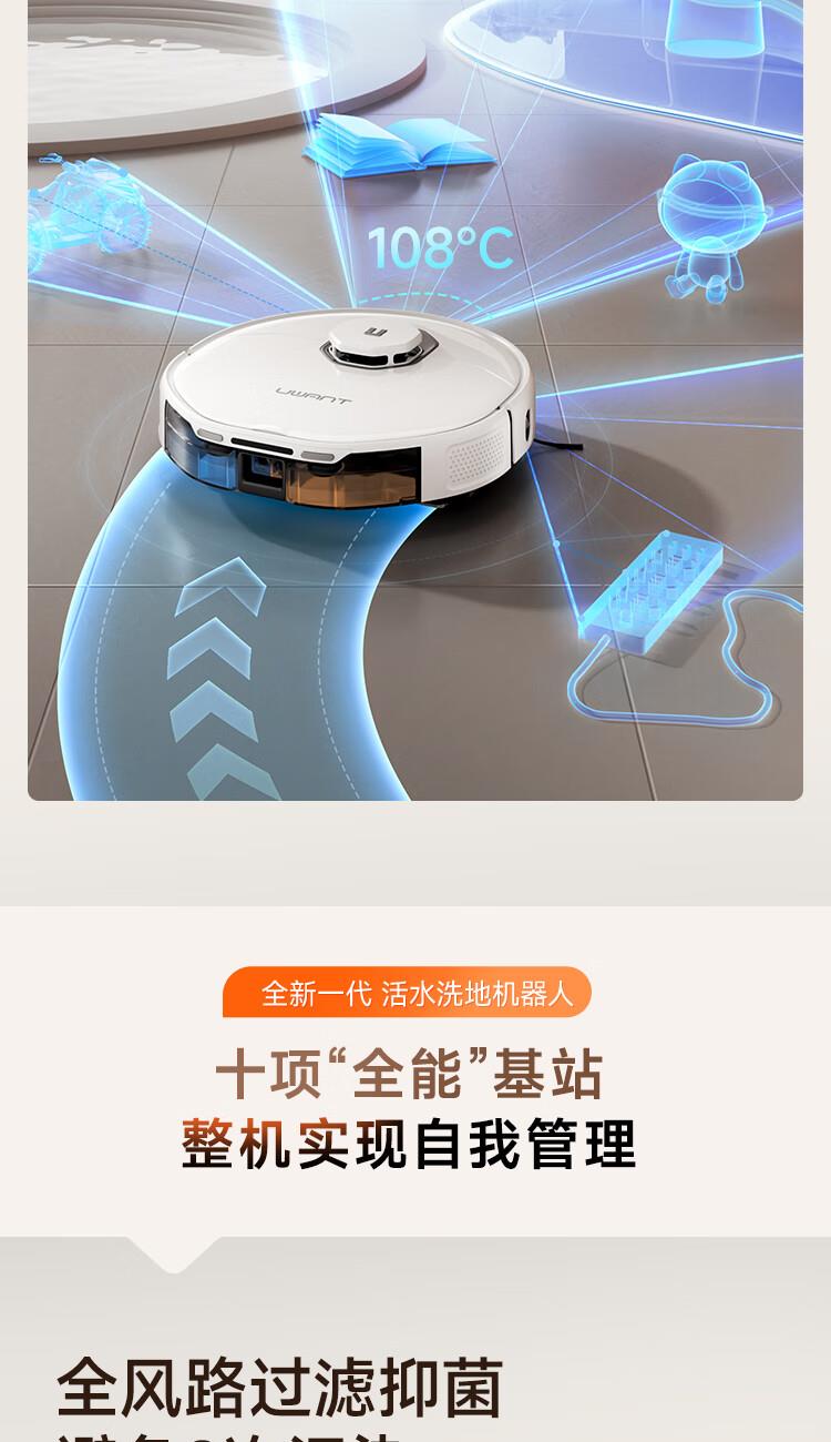 扫地机尺寸:351*346*97mm 电池容量:5000mAh 三档回洗:10/15/25min 烘干时长:3~5小时 滚筒转速:300转/min 噪音:>55dB(A) 吸力:~18000Pa风机 烘干温度:60°C 机载尘盒容量:170ml 黄金飓风吸尘升级大马力风机,吸的更干净 黄金夹角边刷,双旋风防缠绕 活水高速碾压洗地,高温+高压+高转速,拖的干净,缺一不可