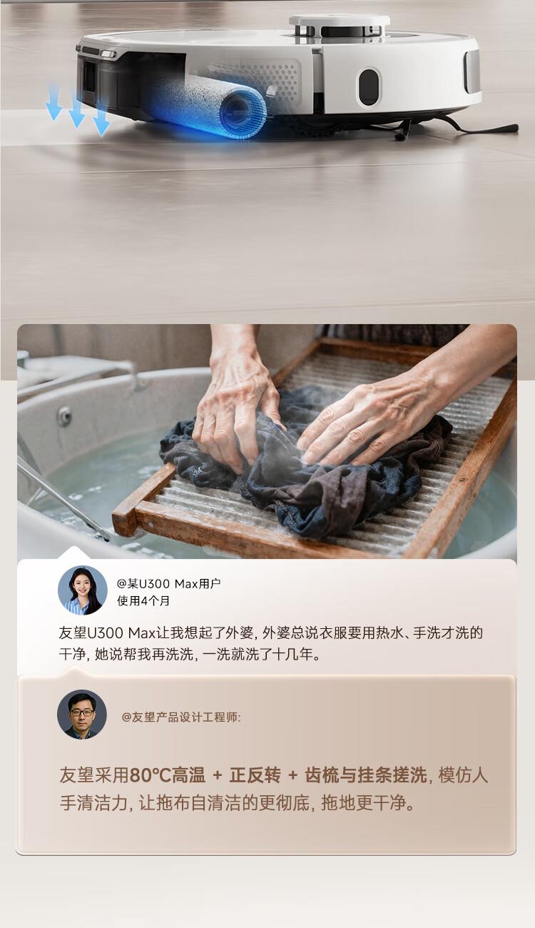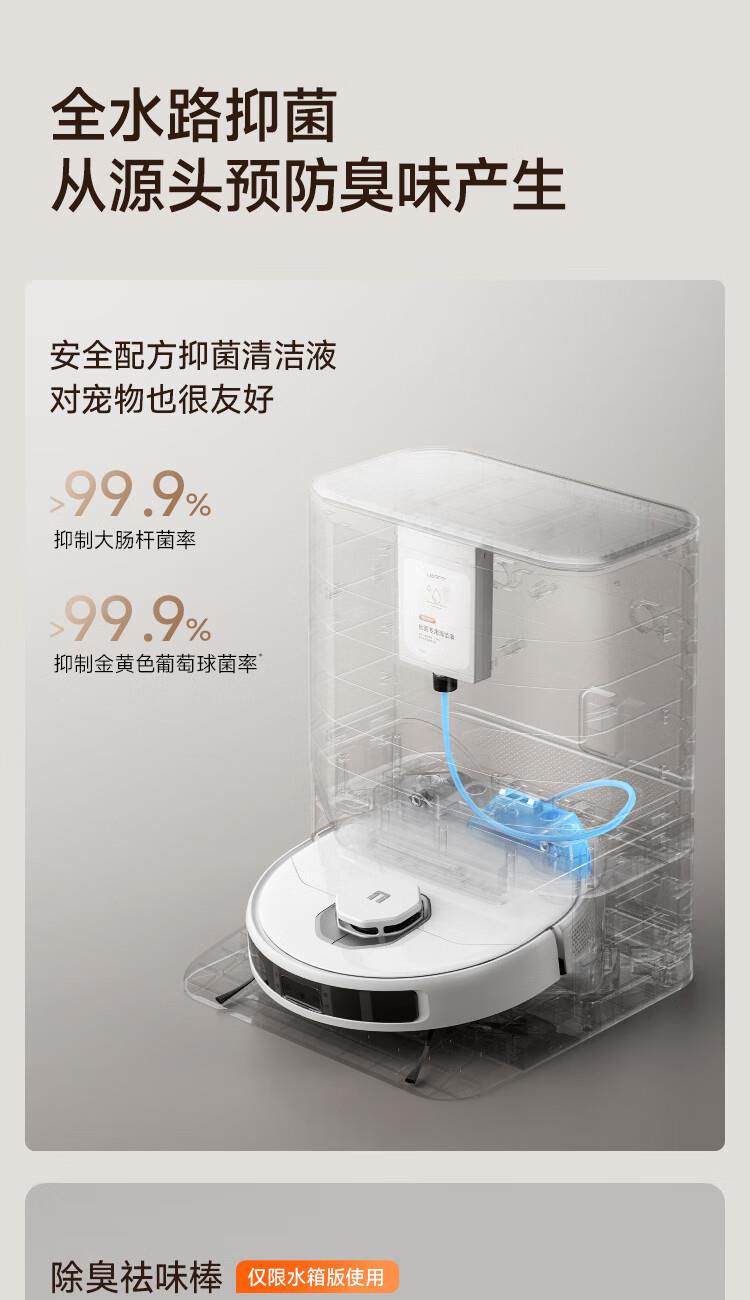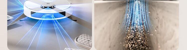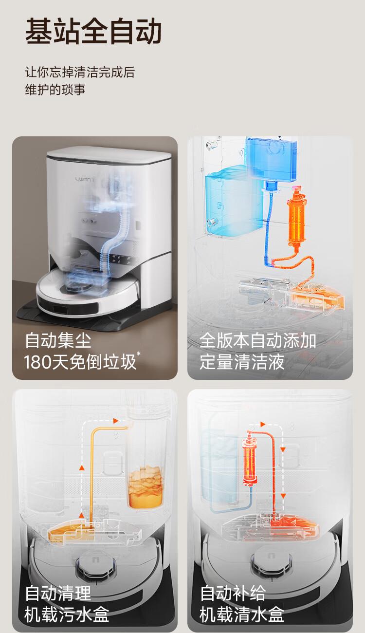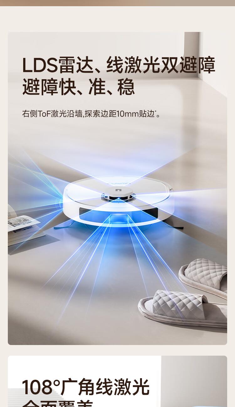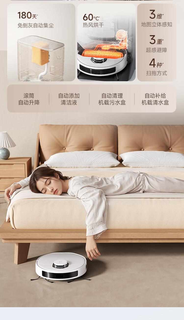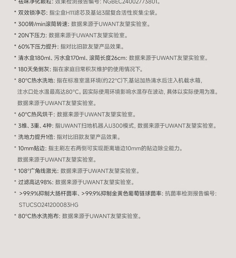 扫地机尺寸:351*346*97mm 电池容量:5000mAh 三档回洗:10/15/25min 烘干时长:3~5小时 滚筒转速:300转/min 噪音:>55dB(A) 吸力:~18000Pa风机 烘干温度:60°C 机载尘盒容量:170ml 黄金飓风吸尘升级大马力风机,吸的更干净 黄金夹角边刷,双旋风防缠绕 活水高速碾压洗地,高温+高压+高转速,拖的干净,缺一不可