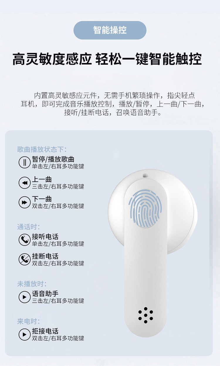 1:真无线蓝牙耳机,采用蓝牙5.1芯片,搭配充电仓,带来非凡的无线耳机体验,即刻取出,待命,先进的触控芯片,音乐控制尽在轻触之间,耳机可聆听约4小时,搭配充电仓使用,耳机的续航时间可达约16小时,美妙音乐与你时刻相伴
