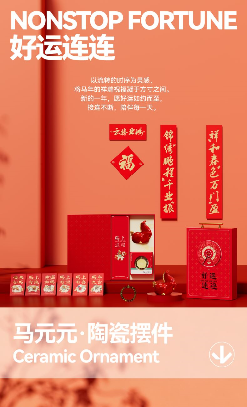 以流转的时序为灵感,将马年的祥瑞祝福凝于方寸之间。新的一年,愿好运如约而至,接连不断,陪伴每一天。