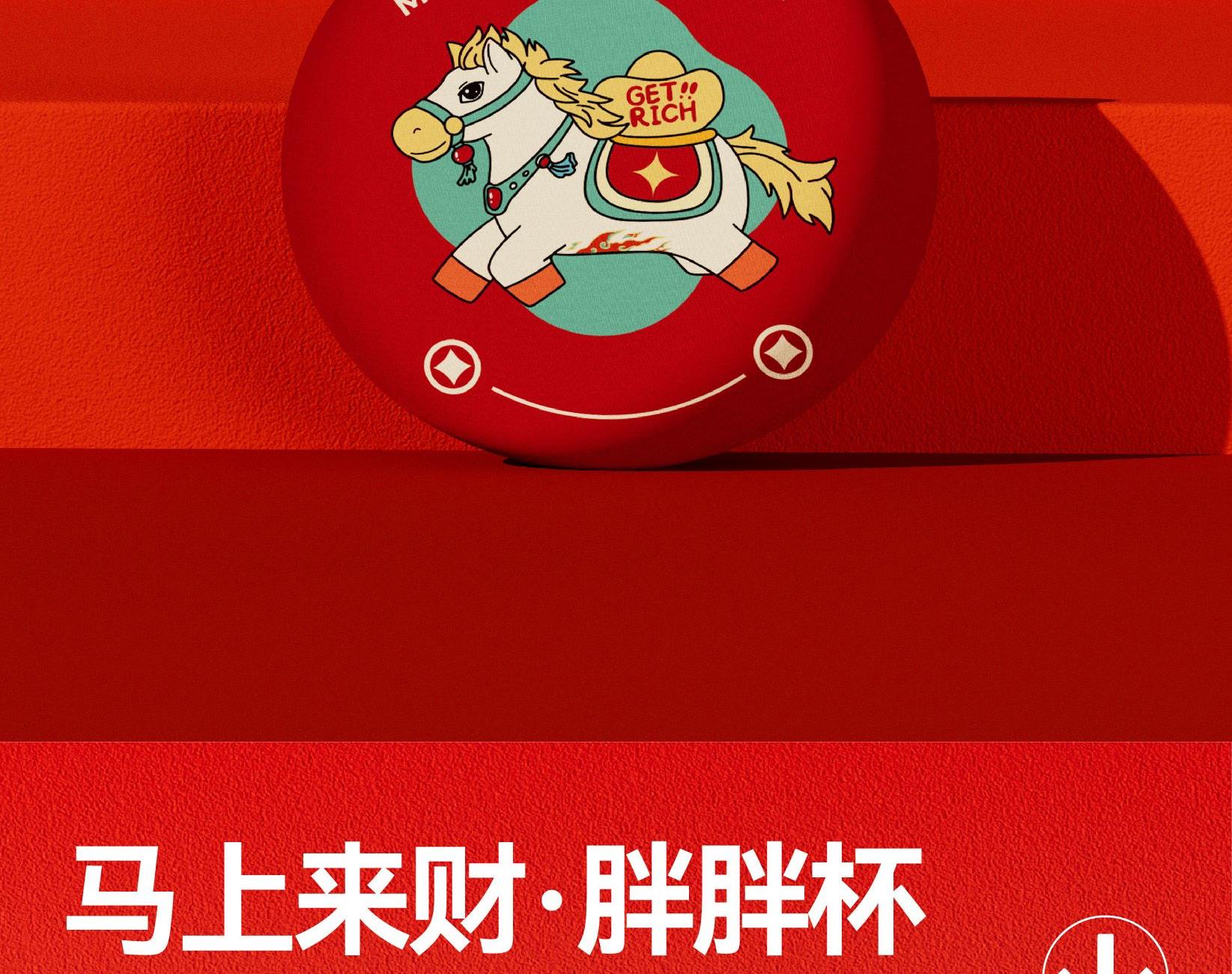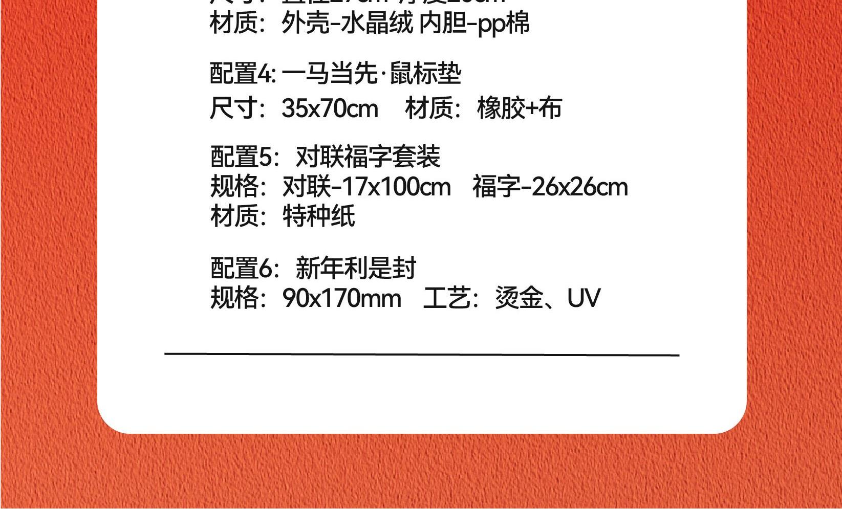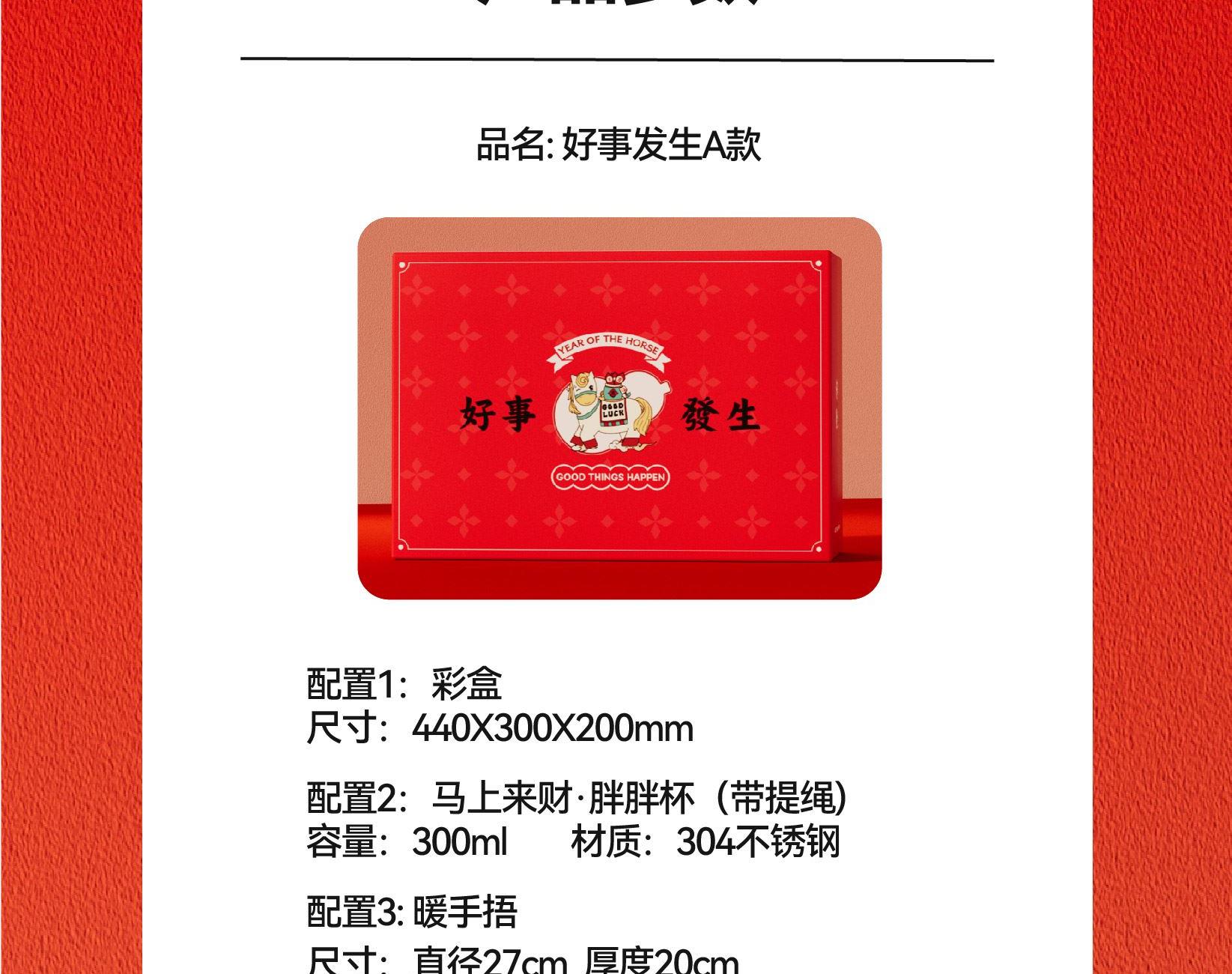 礼盒配置 提盒x1 马上抱富·暖手捂x1 马上来财·胖胖杯x1 壹马当先·鼠标垫x1 对联福字x1 红包x6、贺卡x1