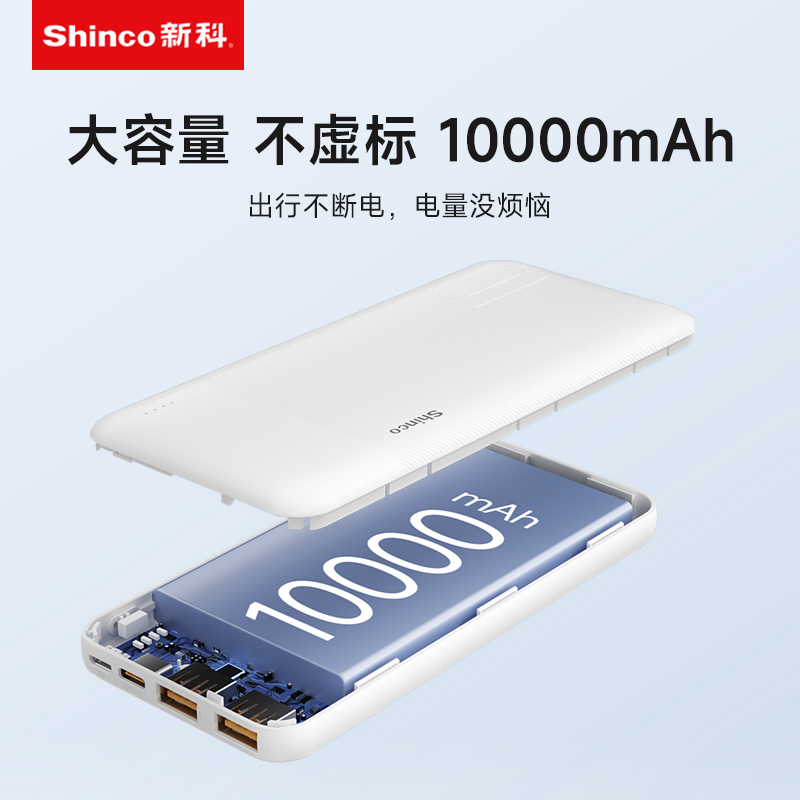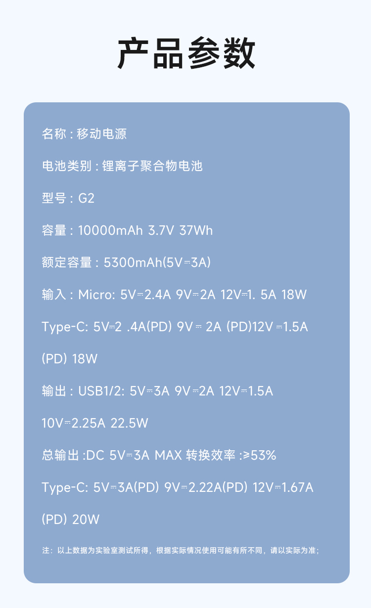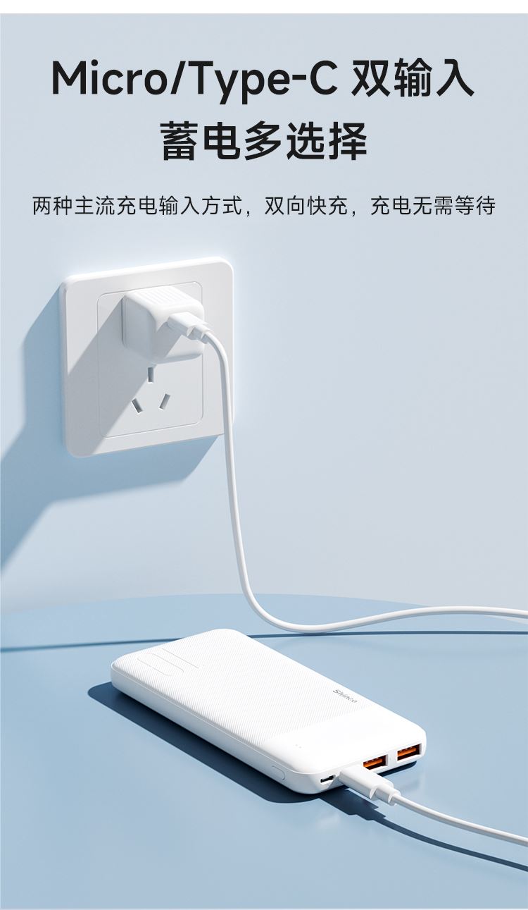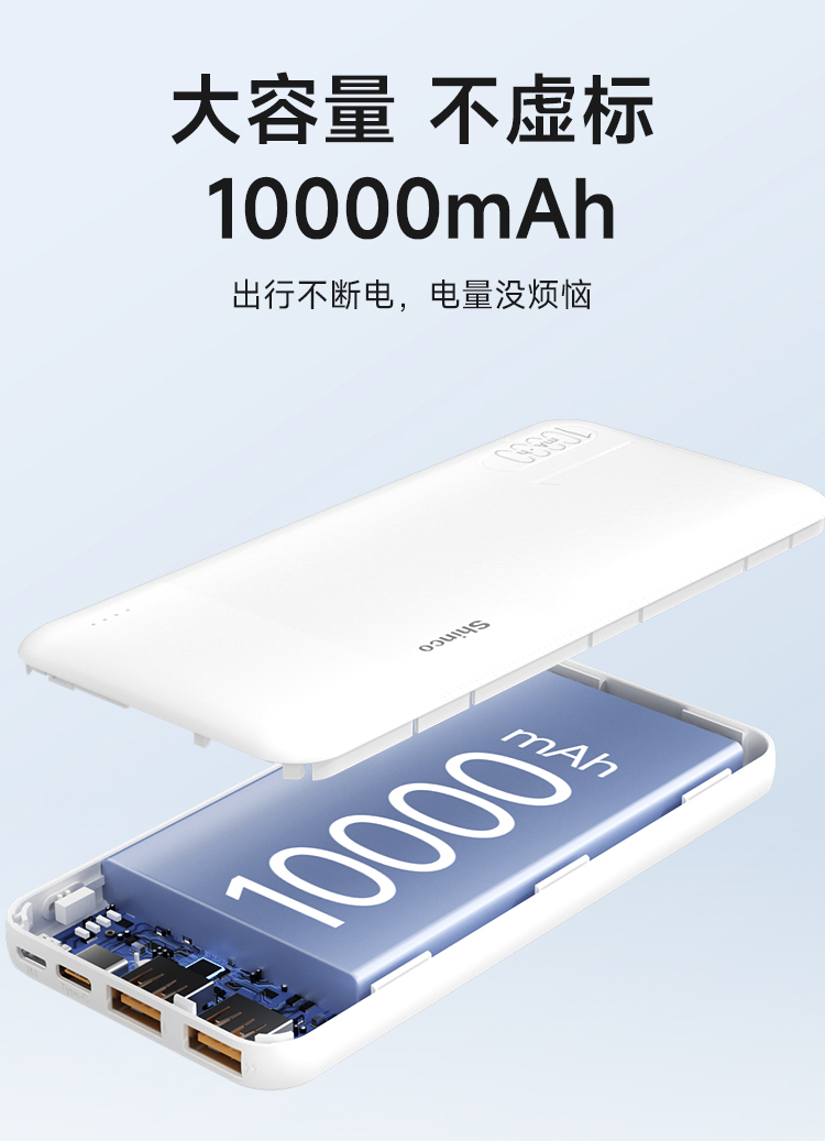 类别:锂离子聚合物电池 容量: 10000mAh 3.7V 37Wh 额定容量: 5300mAh(5V⎓3A) 1、可同时充3台设备、充电不排队、双USB+Type-C输出口,可同时为3台设备输出充电,充电不用等待 2、大容量.不虚标、10000mAh出行不断电,电量没烦恼 3、Micro/Type-C双输入、蓄电多选择两种主流充电输入方式,双向快充,充电无需等待