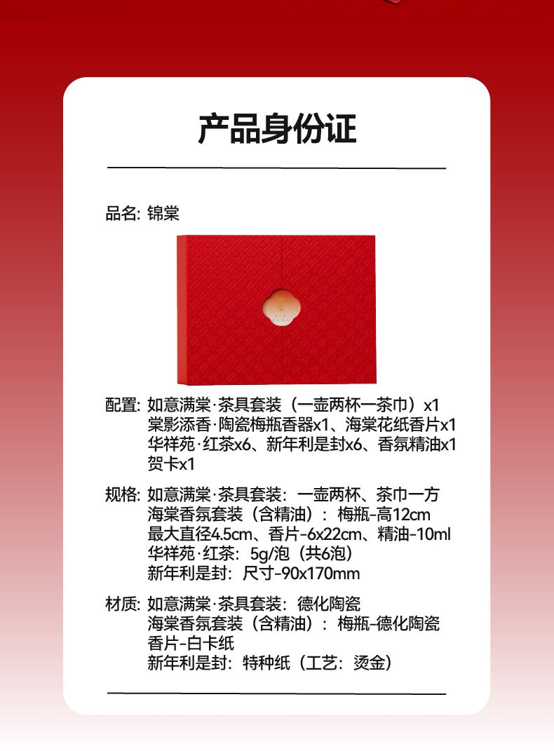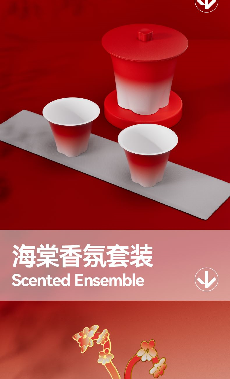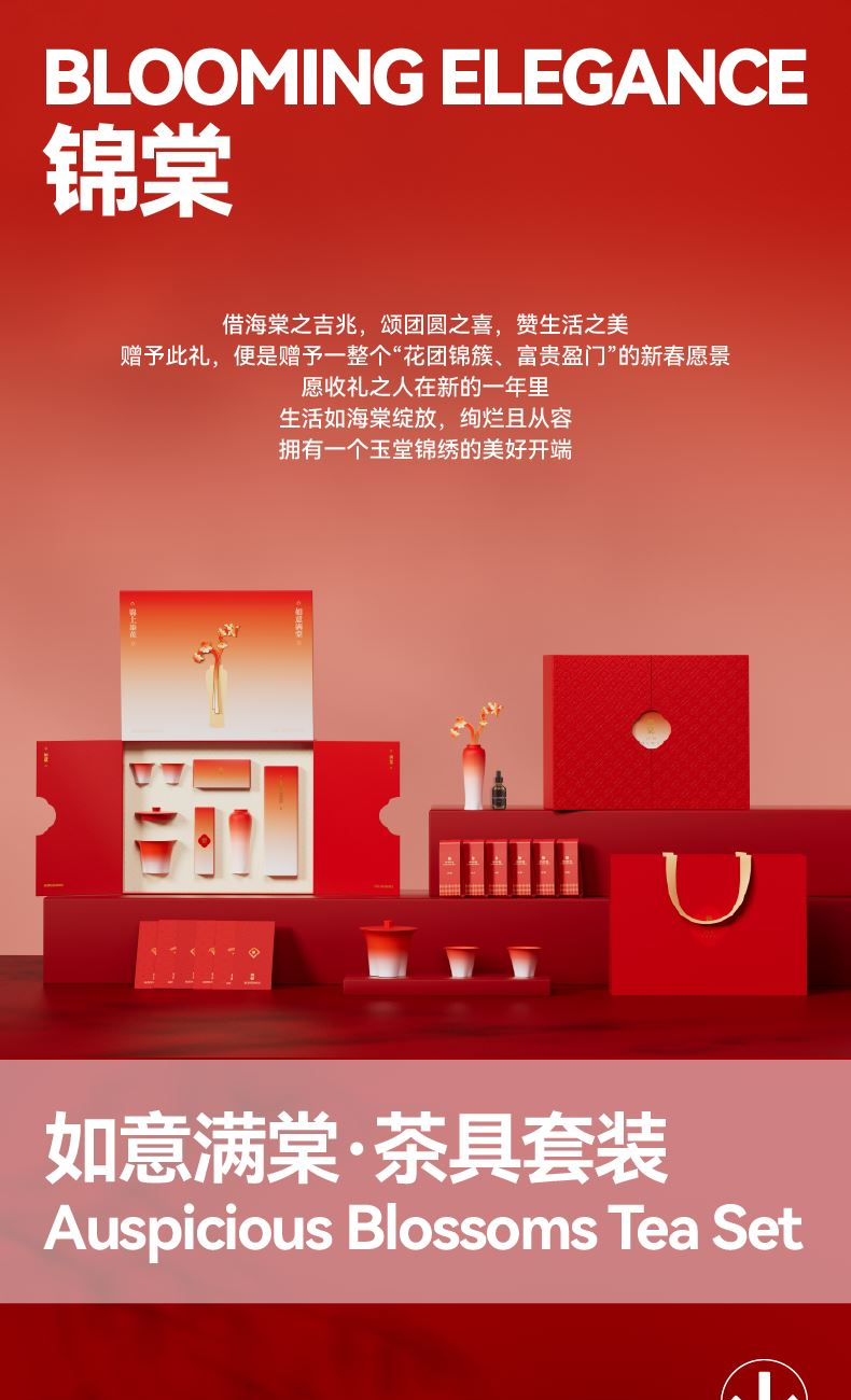礼盒选品融合视觉、触觉、嗅觉与味觉等多感体验,借海棠之吉兆,颂团圆之喜,赞生活之美。赠予此礼,便是赠予一整个“花团锦簇、富贵盈门”的新春愿景,愿收礼之人在新的一年里,生活如海棠绽放,绚烂且从容,拥有一个玉堂锦绣的美好开端。