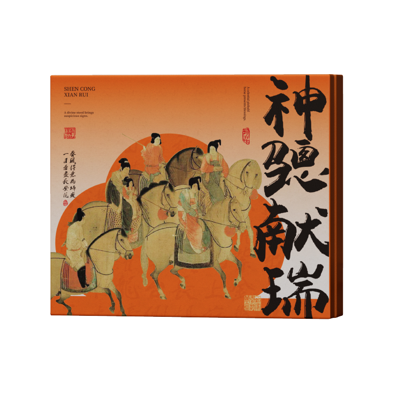 以“神骢献瑞”为引,取意《虢国夫人游春图》中骏马徐行、风华盈路的盛唐气象。马者,乾象天行,寓势如破竹、驰骋万里之志;新春者,万象更始,合纳福迎祥、天地同春之愿。神骢驮载千年文脉与时代新章,以古典笔意勾勒当代吉庆,将诗画中的雍容气度,化为礼盒间流转的东方韵律。