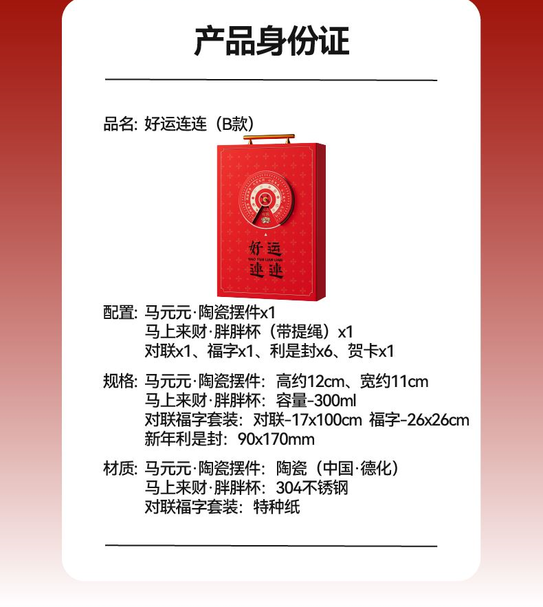 精装提盒 x1、 马元元·陶瓷摆件x1、马上来财·胖胖杯(带提绳)x1